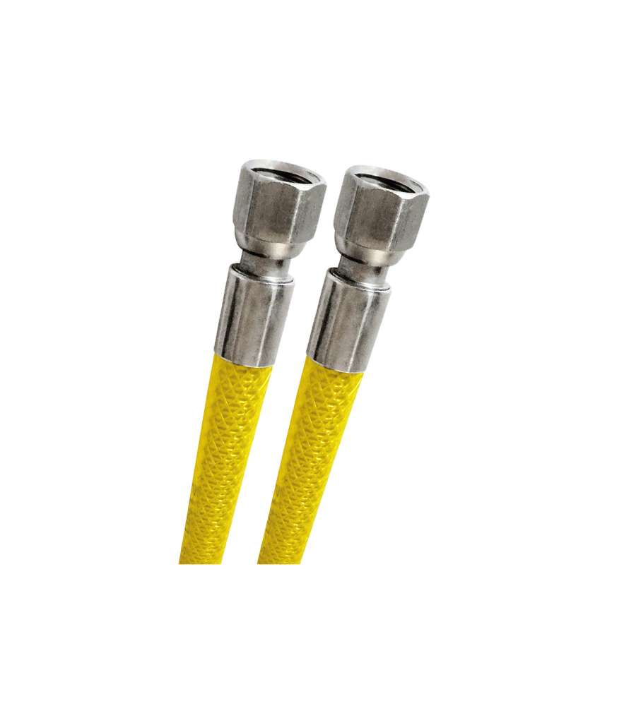 attacco 1/2" femmina - femmina a norme UNI EN 14800 lunghezza 150 cm. in acciaio inox con treccia interna e guaina di copertura doppio strato in PVC raccordi in acciaio Inox per il collegamento di apparecchi domestici a gas naturale e GPL.