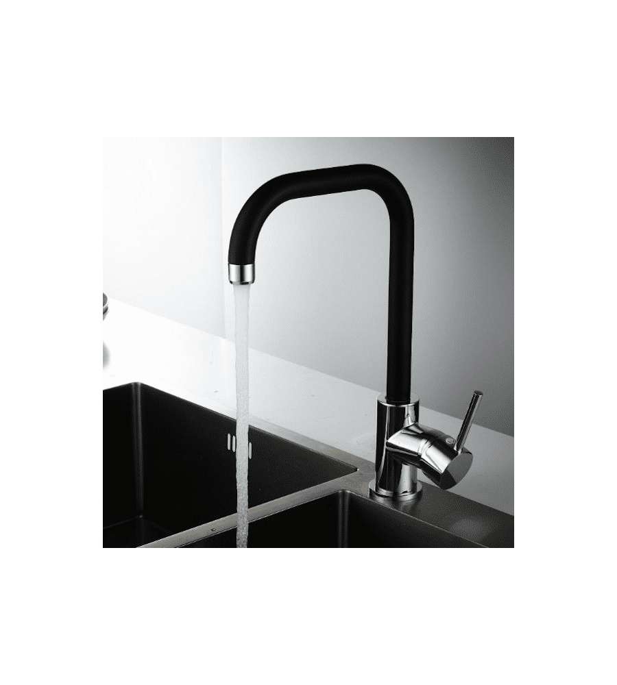 Descrizione: Scopri il miscelatore lavello IDRO-BRIC Florida, elegante in nero satinato e cromo. Bocca alta per comfort, aeratore Neoperl e flessibili inox DVGW da 40 cm. Installazione semplice con set di fissaggio rapido.