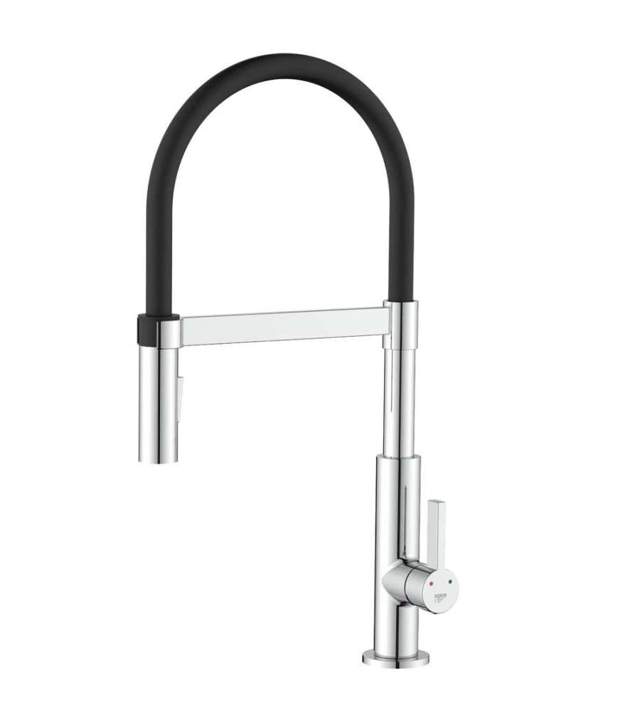 Miscelatore monocomando per lavello con bocca alta, dotato di doccetta ABS a 2 getti orientabile e aggancio magnetico. Finitura cromo, tubo gomma nero, corpo ottone, leva metallo. Rompigetto per risparmio acqua (6 l/min) e cartuccia ceramica Ø 25 mm.Garanzia: