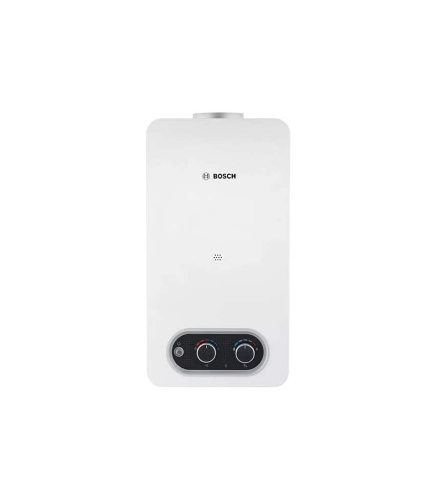 Scaldabagno a gas Bosch Therm 4004, alimentato a GPL, con camera aperta e tiraggio naturale. Produzione acqua calda fino a 10 l/min, potenza fino a 17,4 kW. Triplo sistema di sicurezza, design compatto e senza predisposizione elettrica.Garanzia: