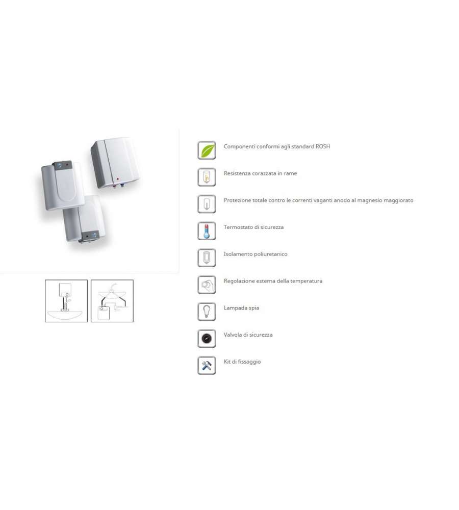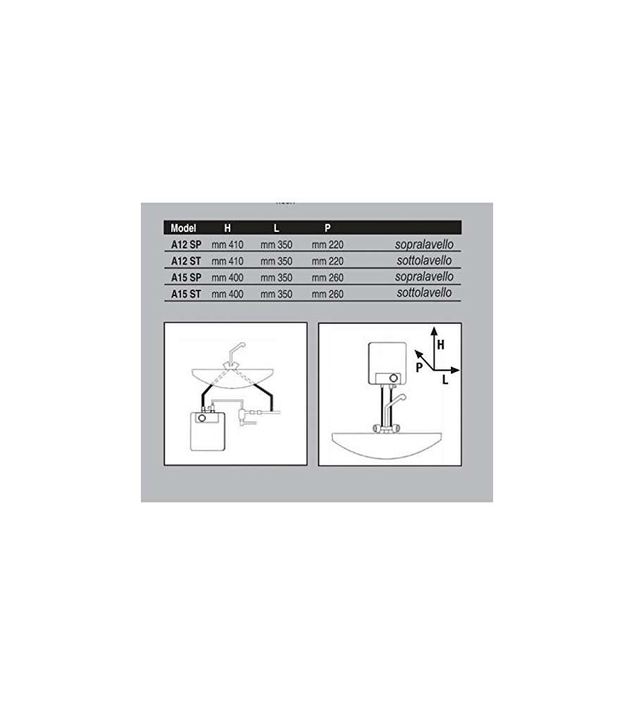 Scaldabagno elettrico da 12 litri, installabile sopra lavello. Isolamento in schiuma di poliuretano per efficienza energetica. Portata di 12 litri al minuto. Garanzia di 5 anni per affidabilità. Design moderno e compatto.Garanzia: