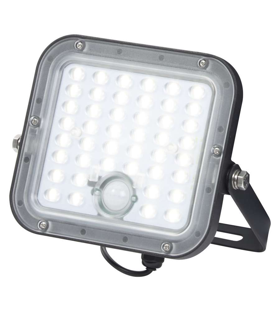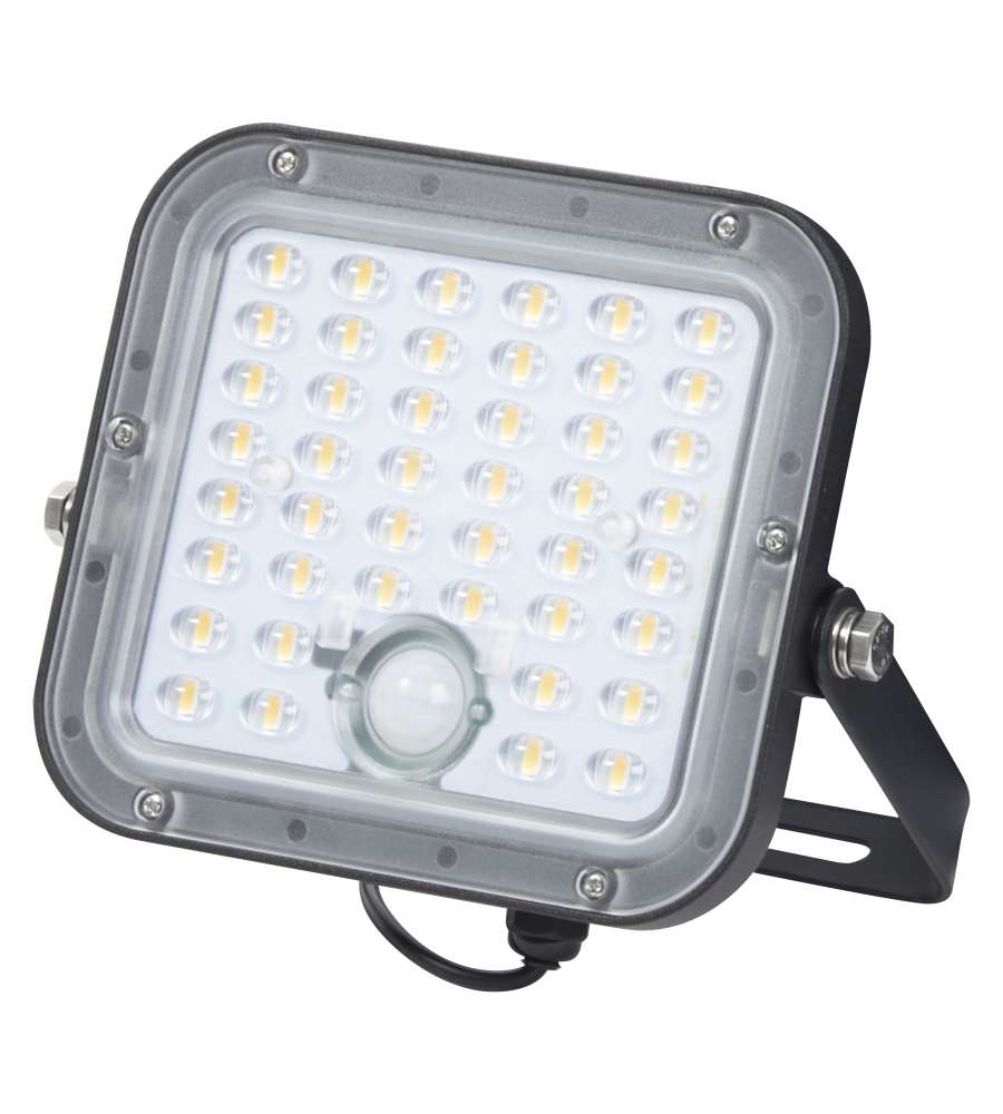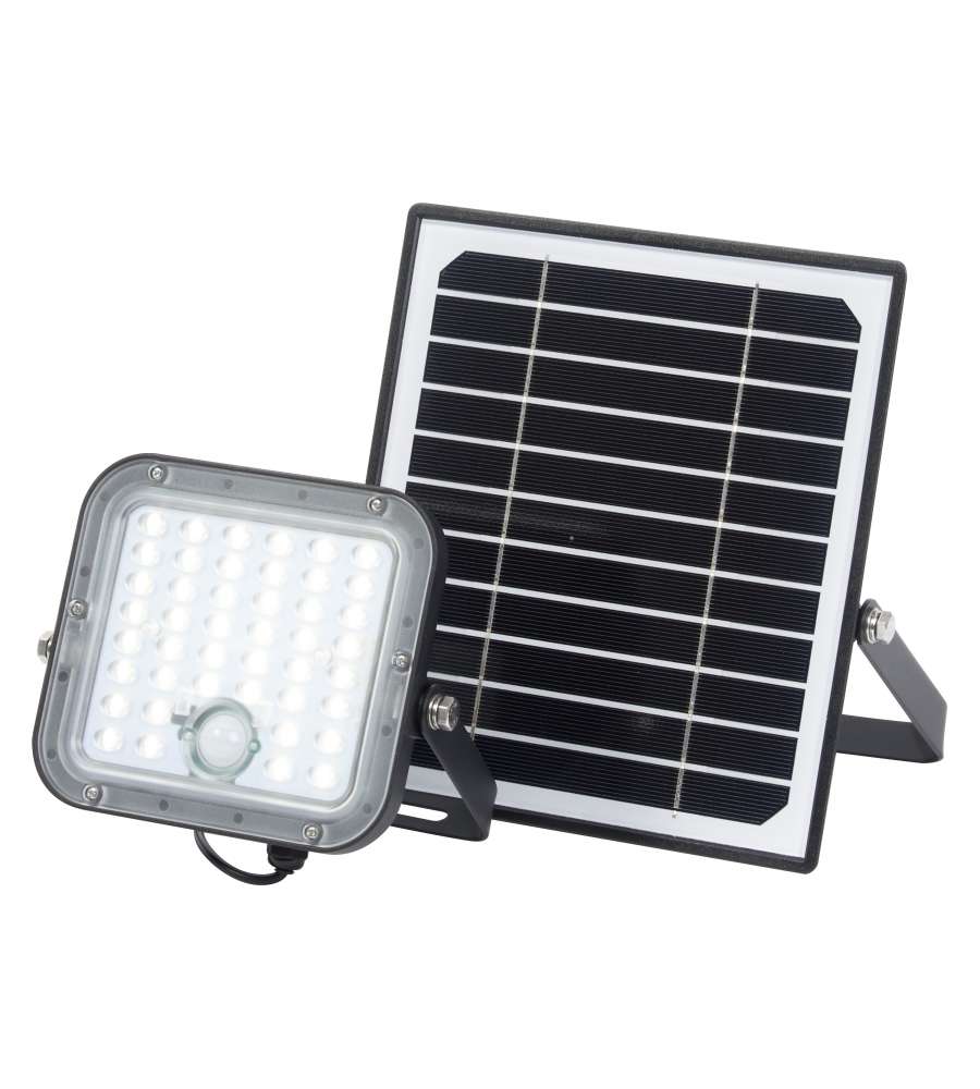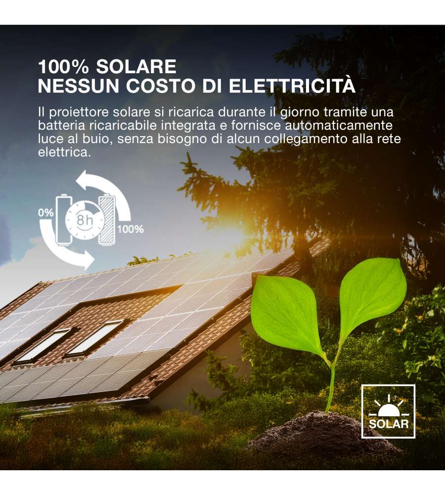 Faro LED da esterno 10W con 1400 lumen e luce 4000K. Montaggio semplice, telecomando per regolazione luminosità, sensore di movimento PIR. Ecologico, alimentato a energia solare, impermeabile e versatile per ogni spazio esterno.Tipo attacco: