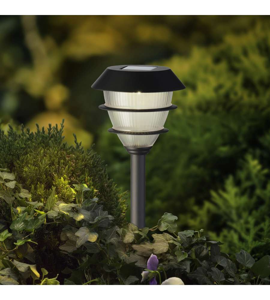 Lampada solare da giardino alta 41 cm con luce bianca calda. Realizzata in plastica nera, è impermeabile e senza fili. Autonomia fino a 6 ore, facile da installare e perfetta per vialetti e aiuole. Design compatto e interruttore incluso.Lumen: