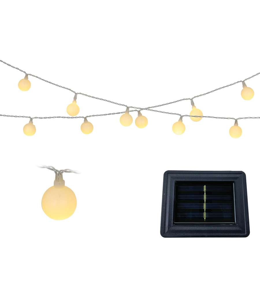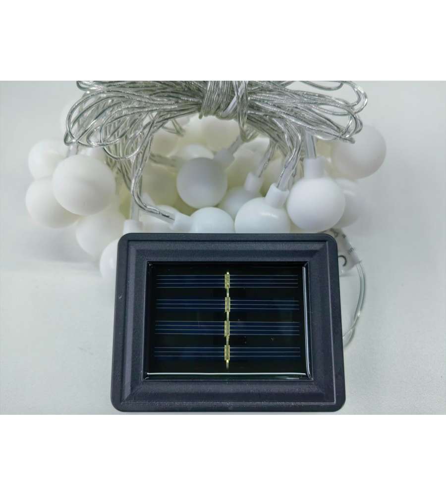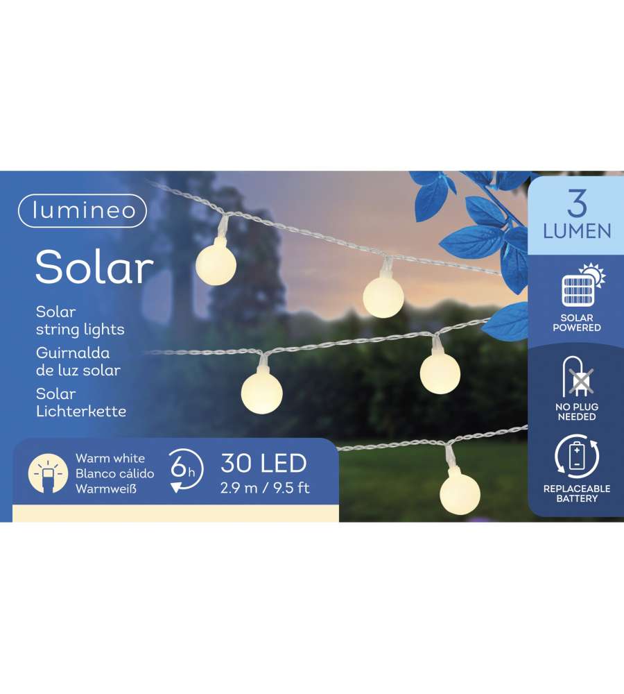 Catena luminosa solare da 2,9 m con 30 lampadine a sfera in bianco caldo. Funzionamento a energia solare, durata fino a 6 ore. Design decorativo, ideale per giardini e feste. Inclusa batteria sostituibile. Facile da installare.Tipo luce: