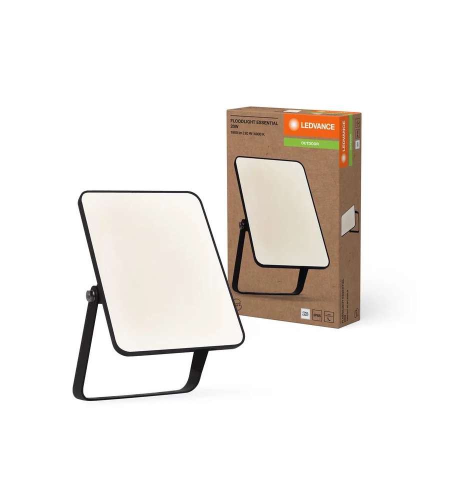 Faretto LEDVANCE Essential da 20W, luce bianca fredda 4000K, flusso luminoso di 1.800 lm, angolo del fascio 100°, IP65 per uso esterno, corpo in alluminio nero, durata 25.000 ore.Lumen: