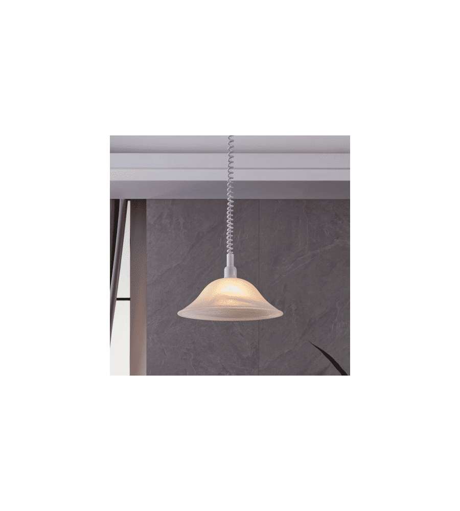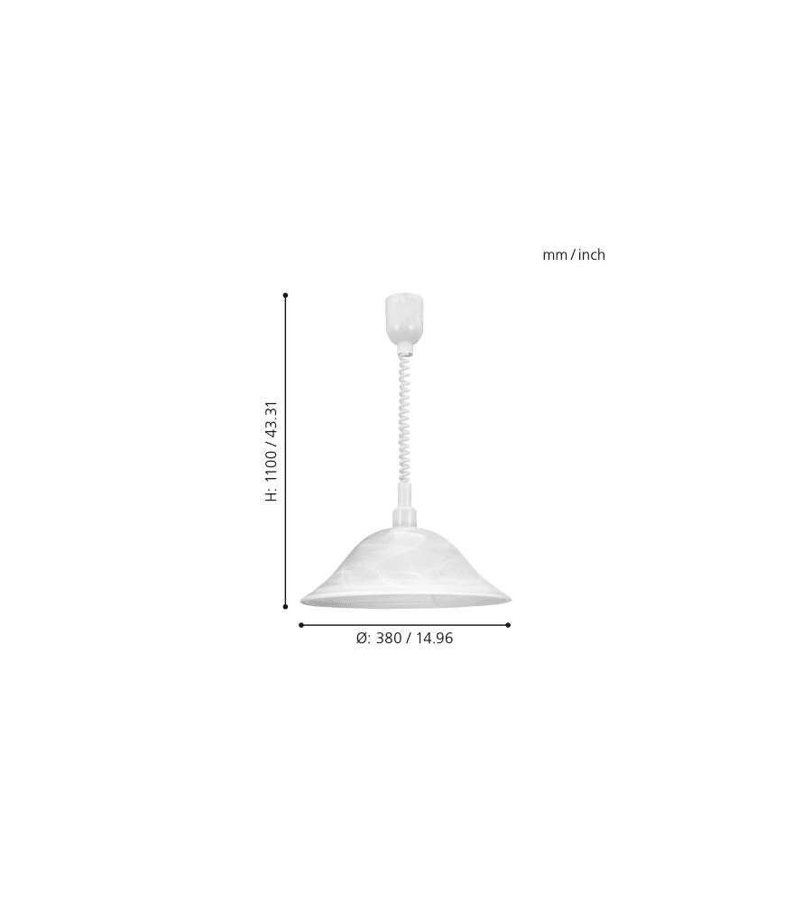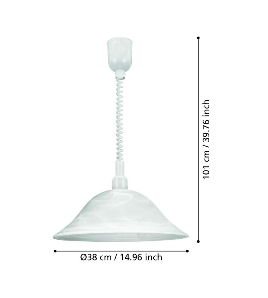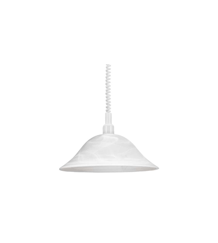 Lampada a sospensione con paralume in vetro alabastro bianco e struttura in policarbonato. Altezza regolabile fino a 110 cm, diametro di 38 cm. Compatibile con lampadine E27 fino a 60W. Design elegante, ideale per cucina e sala da pranzo.Garanzia: