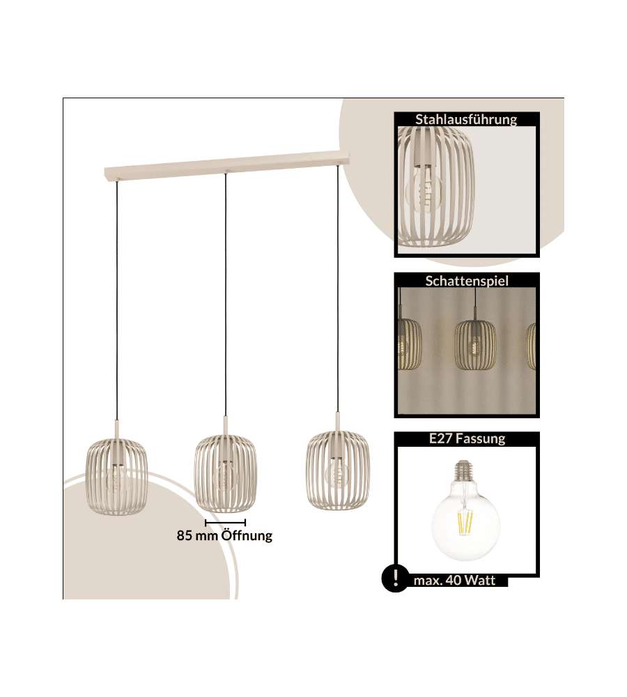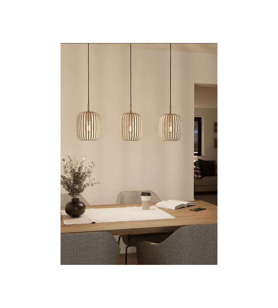 Descrizione: Scopri la lampada a sospensione Romazzina di EGLO: design nordico con 3 paralumi in metallo color sabbia. Perfetta per soggiorno e sala da pranzo, crea un affascinante gioco di luci. Attacco E27.