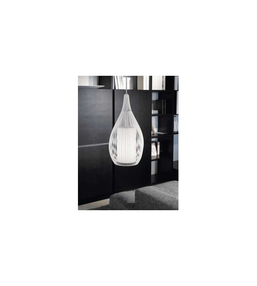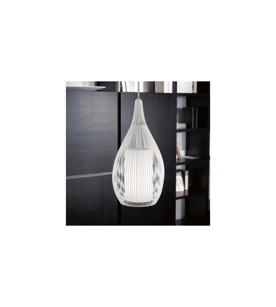 Lampadario a sospensione RAZONI in bianco, realizzato in metallo e vetro satinato. Design minimalista, compatibile con lampadine E27 fino a 60W. Dimensioni: Ø19 cm, altezza max 130 cm. Classe energetica A+++ - E, installazione a soffitto.Tipo attacco: