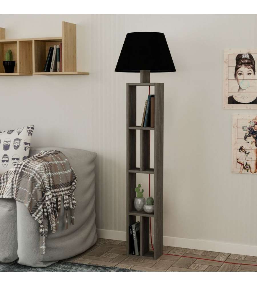 Lampada da terra Giorno in legno con libreria e paralume nero