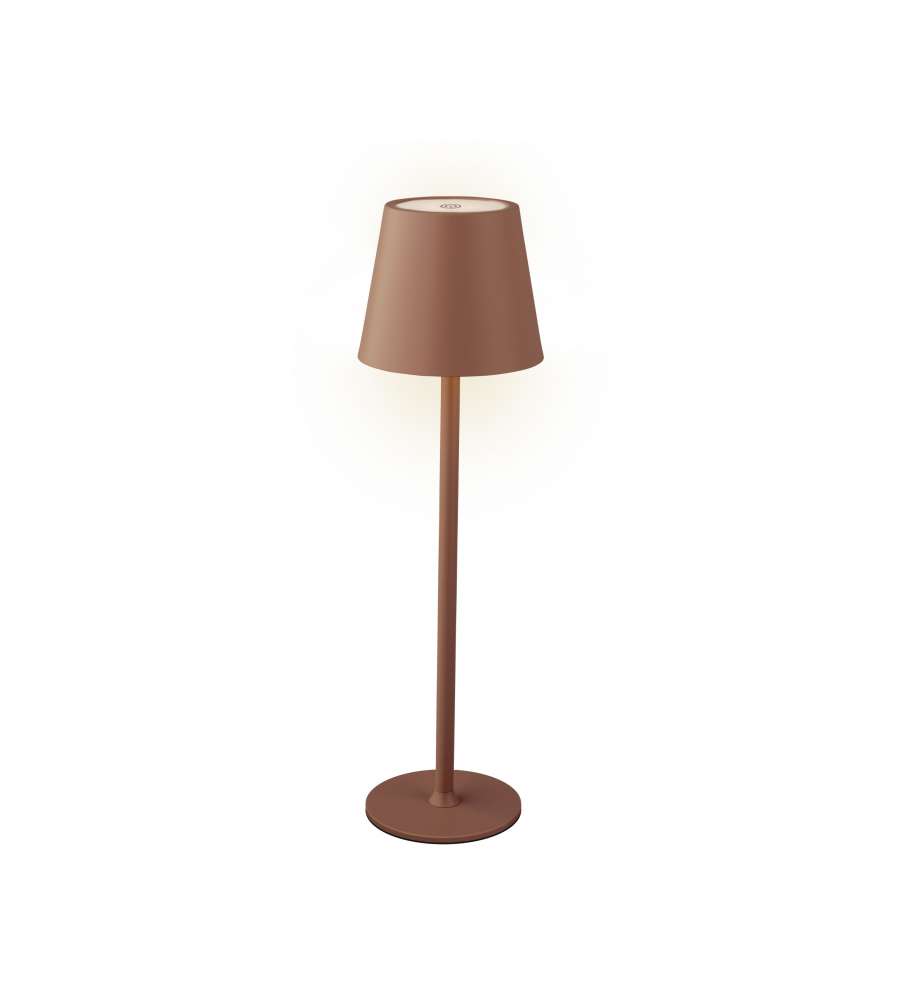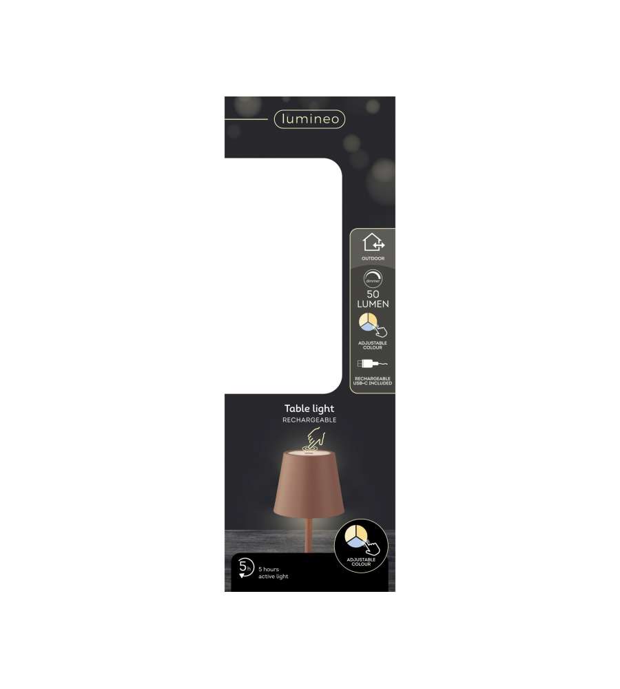 Descrizione: Lampada da tavolo Lumineo in caldo marrone, ricaricabile e versatile. Design elegante con luce regolabile, ideale per interni ed esterni. Fino a 4.5 ore di luminosità continua per un'atmosfera accogliente.