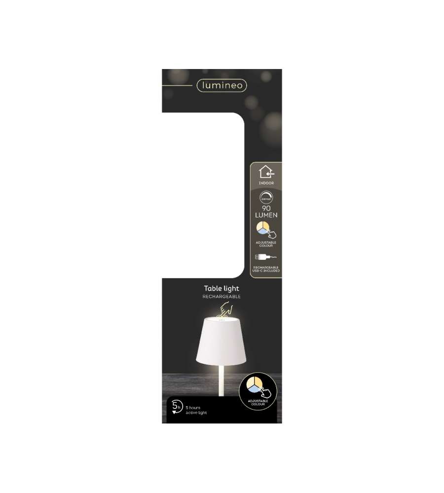 Descrizione: Lampada da tavolo LED ricaricabile Lumineo, bianca, 27 cm. Design moderno in metallo, 3 tonalità di luce, batteria 1200 mAh. Perfetta per interni, unisce stile e funzionalità.