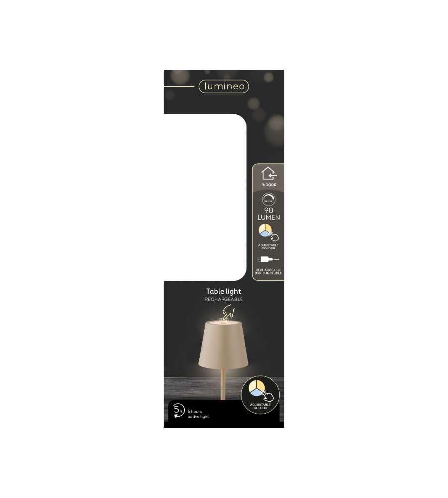 Lampada da tavolo LED ricaricabile, color sabbia, altezza 27 cm. Design moderno in metallo, 3 tonalità di luce e 90 lumen. Ricarica USB-C inclusa, ideale per interni, unisce stile e funzionalità.Altro 1: