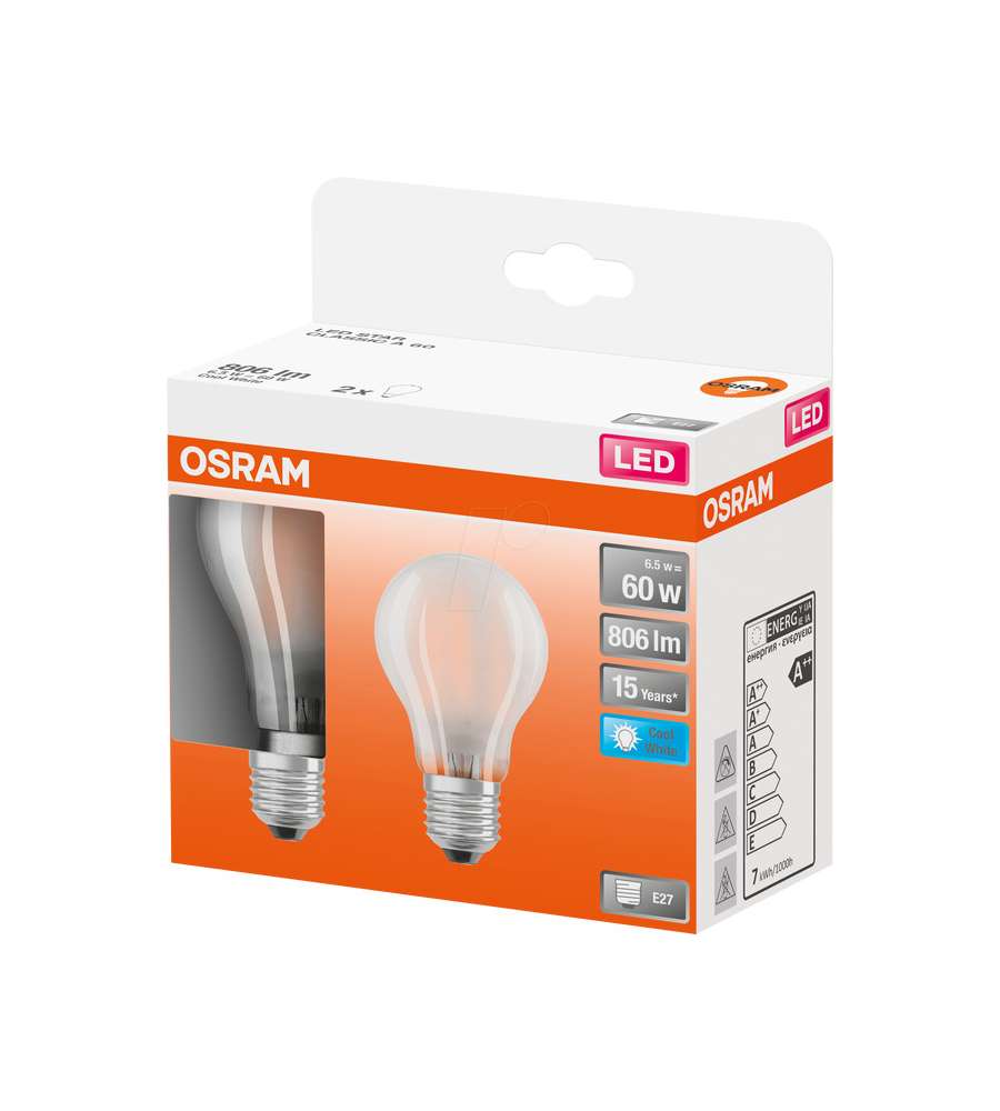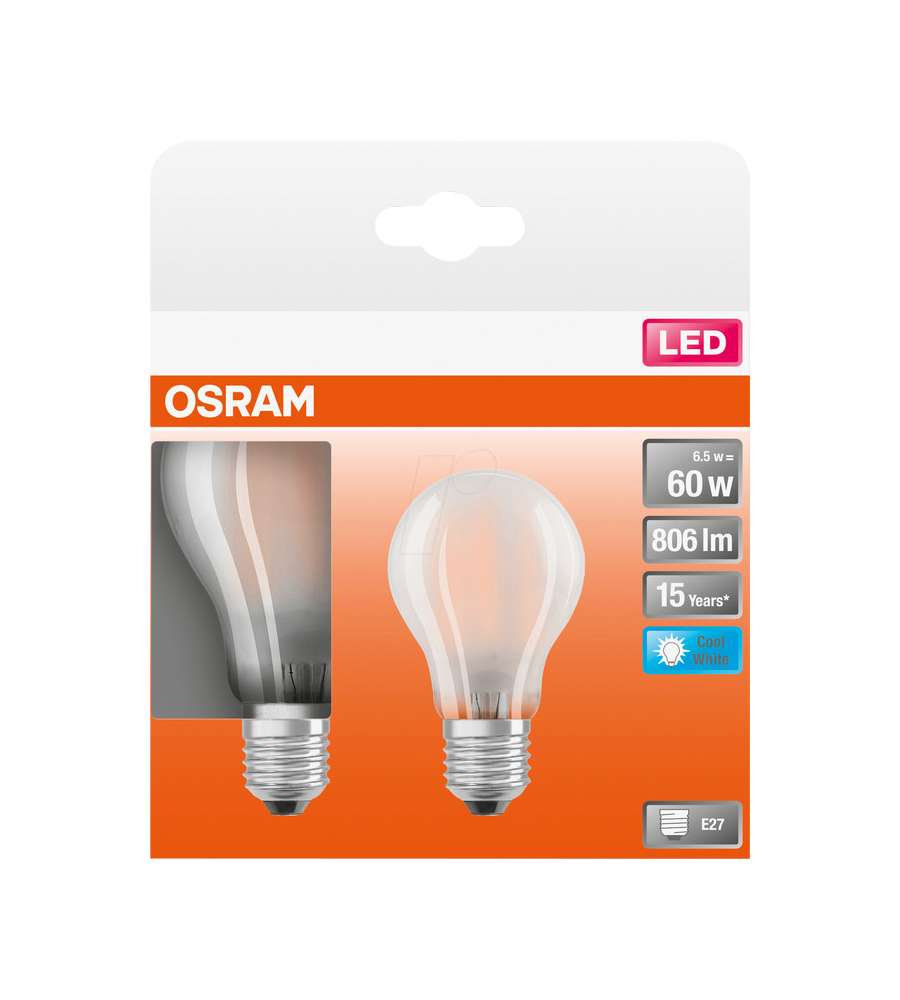 Descrizione: Lampadine LED Osram E27 con tecnologia "filament". Confezione da 2, 806 lm, bianco freddo (4000K). Ideali per illuminazione domestica e decorativa, durano fino a 15.000 ore. 6,5W corrispondenti a una lampadina a incandescenza o alogena da 60W.