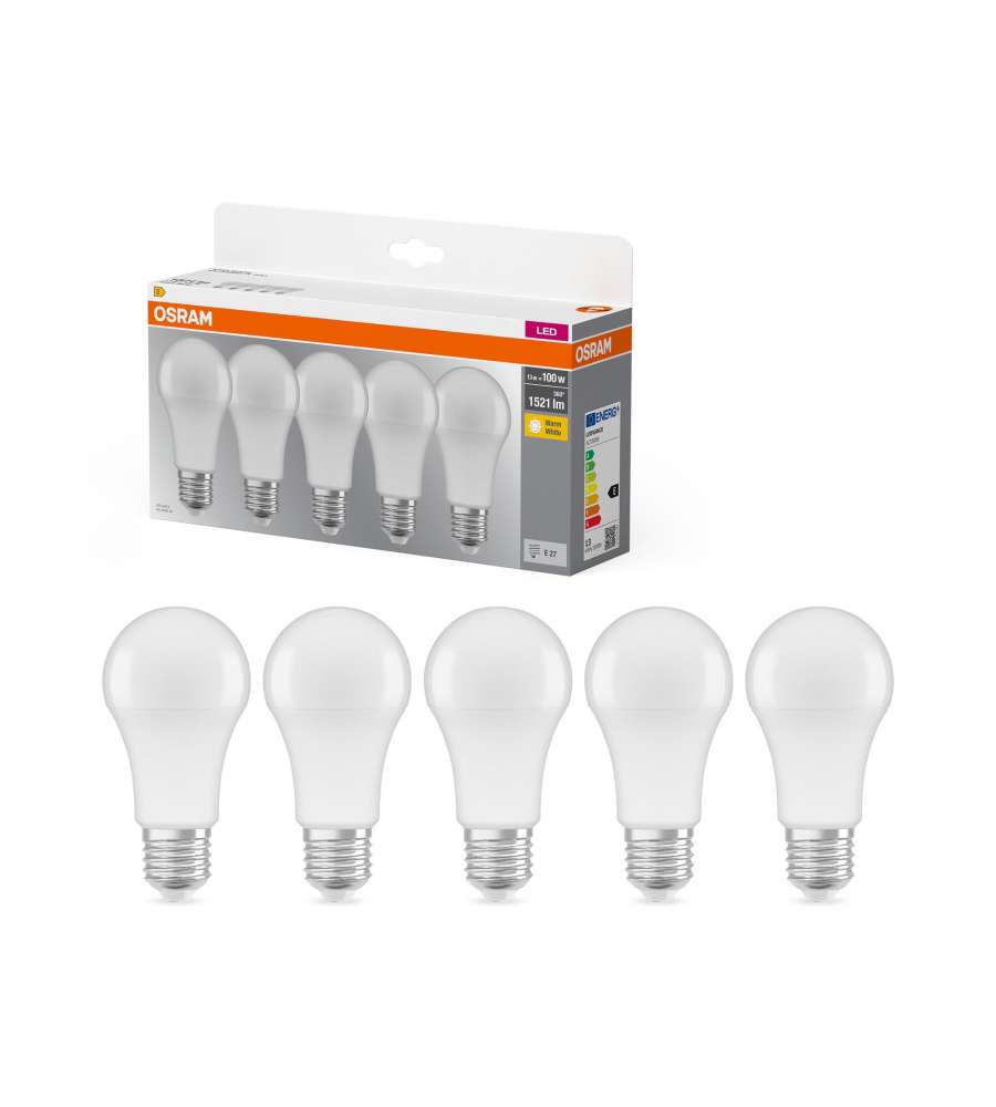Descrizione: Lampadina LED E27 13W Osram, ideale per illuminazione domestica. Flusso luminoso di 1521 lm, luce bianca calda (2700K). Efficienza energetica elevata e lunga durata fino a 10.000 ore. Confezione da 5.