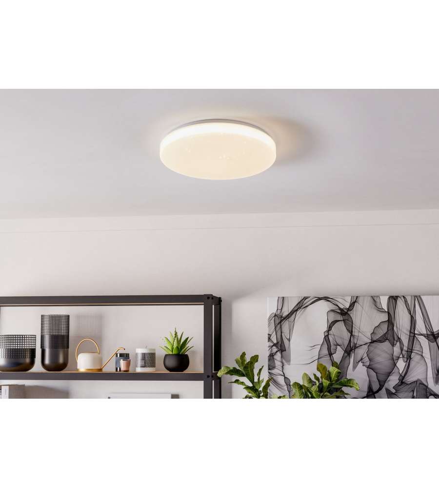 Descrizione: Plafoniera LED Eglo Pogliola-E da 15,6W, 1900 lumen e 4000K per una luce bianca naturale. Struttura in acciaio con finitura di colore bianco e diffusore in plastica effetto cristallo. Diametro di 310 mm.