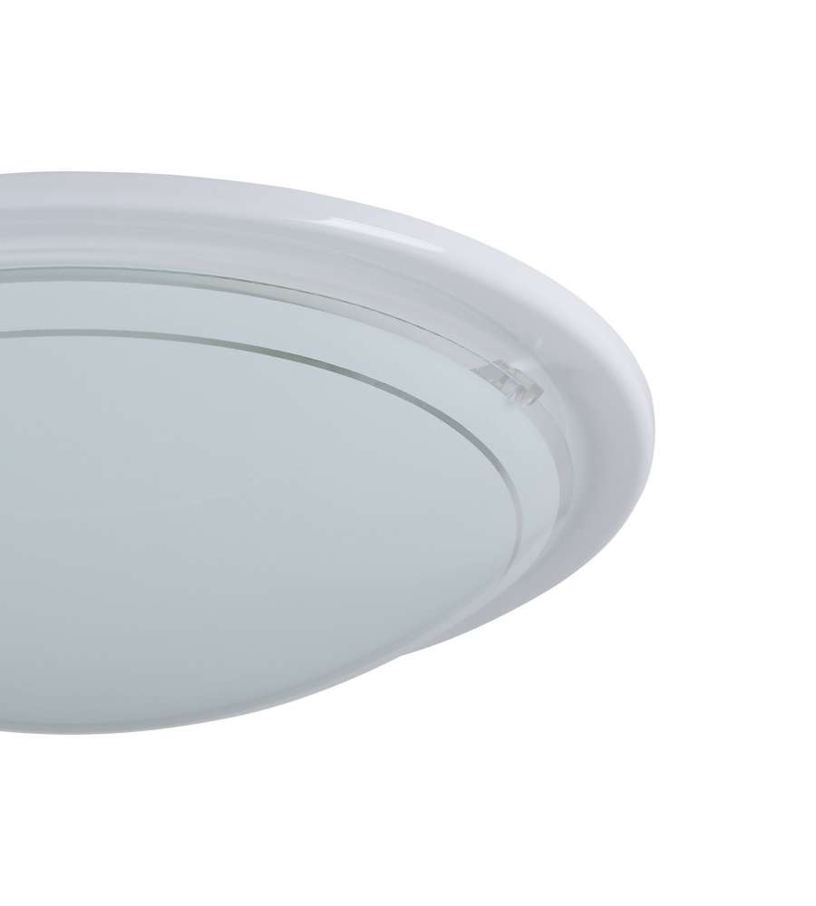 Plafoniera rotonda in acciaio bianco con diffusore in vetro serigrafato. Diametro di 290 mm e altezza di 85 mm. Attacco E27, potenza max 25W. Design elegante, ideale per interni come cucine e soggiorni. Certificazione IP20.Garanzia: