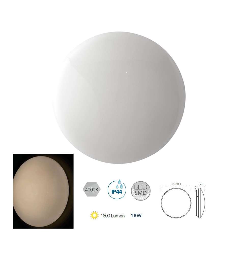Potenza di 18W, tonalità di colore luce naturale 4000K, alimentata a 230V. Grado di protezione IP44: può essere posizionata in particolari ambienti umidi o in corrispondenza di docce o vasche da bagno.Equivalente a incandescenza: