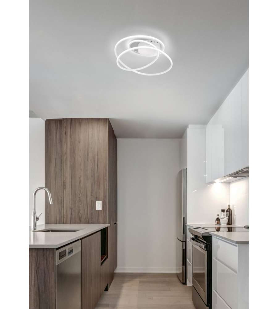Plafoniera LED Bologna in metallo bianco opaco, 36W, 5100 lumen, luce bianca neutra 4000K. Include dimmer integrato per tre livelli di luminosità. Ideale per interni, lunga durata di 30.000 ore. Montaggio a soffitto, dimensioni 50x48x28 cm.Garanzia: