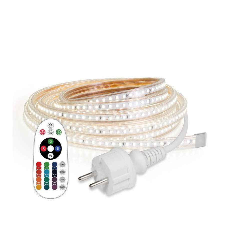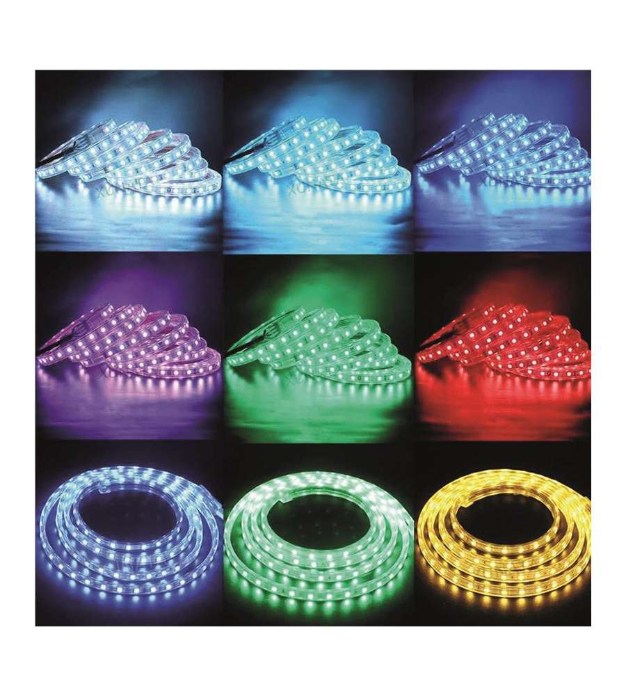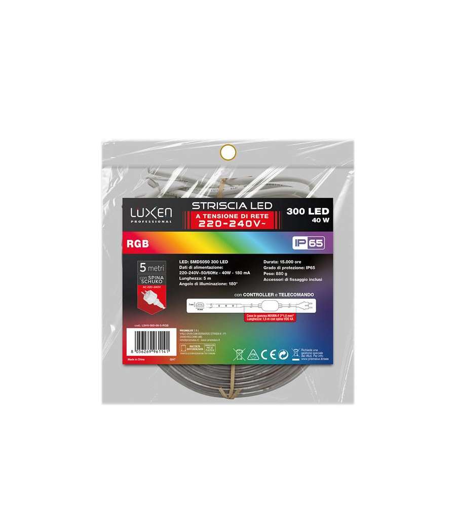 Striscia LED RGB 5m, potenza 40W, grado di protezione IP65 per uso interno ed esterno. Facile installazione, flessibile e resistente, ideale per decorazioni e illuminazione d'atmosfera. Compatibile con controller RGB.Consumo: