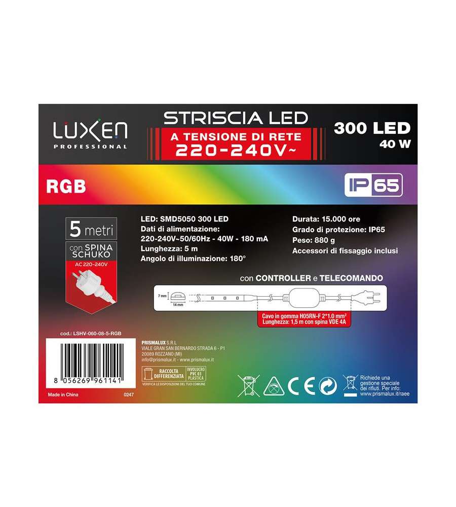 Descrizione: Illumina i tuoi spazi con il Kit Striscia LED 5M RGB PRISMALUX. Impermeabile (IP65) e potente (40W), offre colori vivaci e personalizzabili. Facile installazione e adattabile a ogni ambiente.