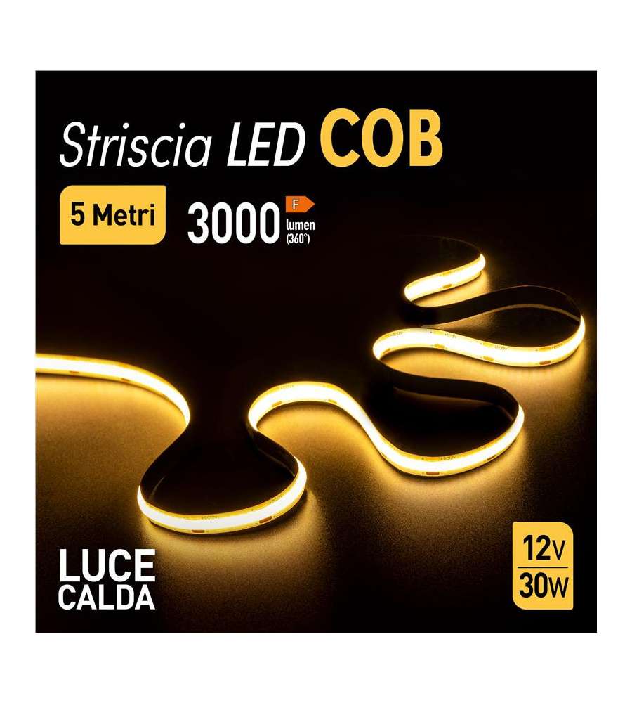 Striscia LED di 5 metri con alimentazione singola, potenza di 30W e luminosità di 3000 lumen. Temperatura colore di 3000K, ideale per illuminazione calda e accogliente. Facile da installare e adattabile a vari usi.Consumo: