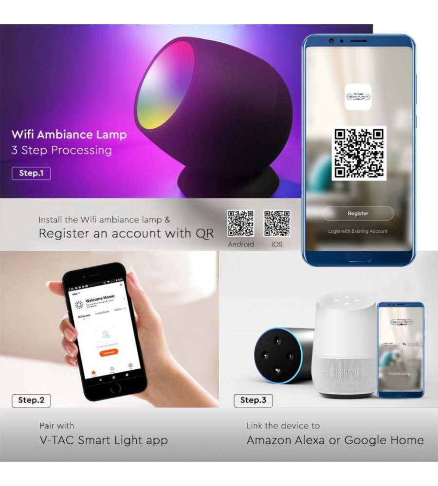 V-TAC Smart Home Lampada LED da Tavolo 2.2W Smart WiFi RGB + 3in1 CCT Dimmerabile Colore NeroLumen: