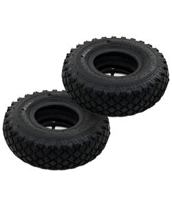 I pneumatici e le camere d'aria sono realizzate in robusta gomma resistente alle abrasioni. I pneumatici sono caratterizzati da uno speciale design del battistrada che, ad una maggiore velocit? operativa, ? in grado di offrire l'aderenza ottimale. Le camere d'aria aiutano a mantenere costante la pressione e a prevenire perdite d'aria nei pneumatici. Il set di pneumatici di ricambio e le relative camere d'aria sono ideali per un'utilizzo privato, commerciale e industriale, ma non per uso autostradale.