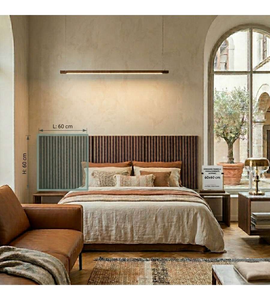 Trasforma le tue pareti in superfici eleganti e silenziose. Il pannello murale fonoassorbente con listelli in MDF effetto Noce Chiaro Termoretraibile unisce un design contemporaneo a doghe verticali con prestazioni acustiche concrete, riducendo eco e riverbero negli ambienti interni. Il caldo tono brunito del noce, con le sue venature profonde e avvolgenti, crea un'atmosfera sofisticata e raccolta, ideale per soggiorni, camere da letto, uffici e home theater. Grazie al formato modulare 60×60 cm, i pannelli si affiancano liberamente per creare composizioni su misura, pareti accent wall di grande impatto estetico o eleganti testate letto.
