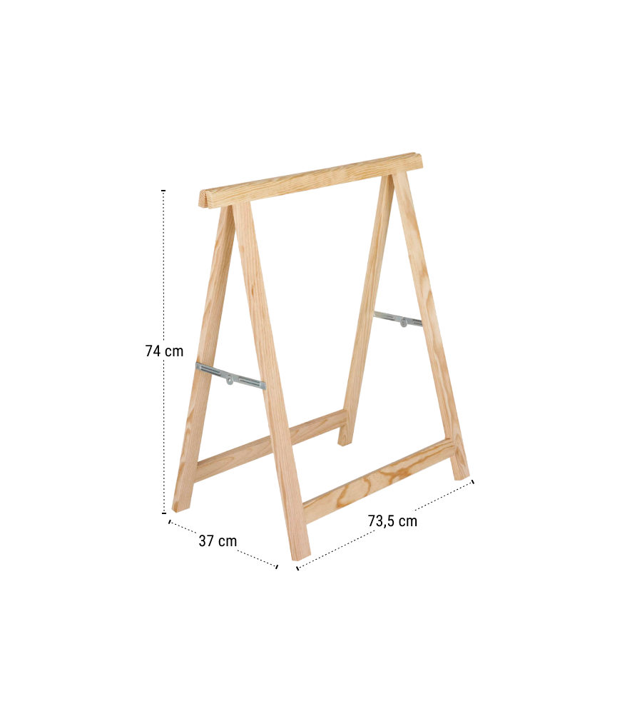Cavalletto in pino massiccio con cerniere e aste snodate. Dimensioni: 73,5 x 77 cm. Ideale per uso professionale.
