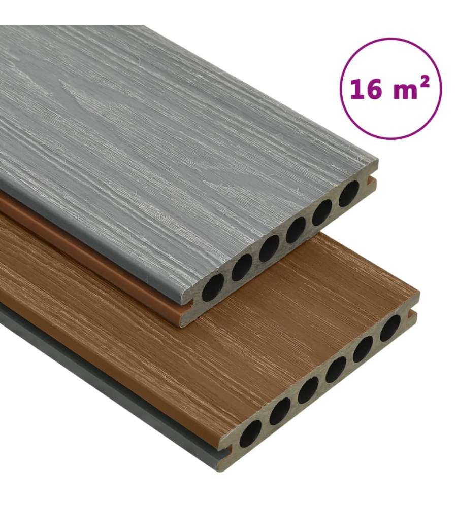 I listoni da terrazza sono realizzata in legno composito plastico, resistenti all'acqua e altamente durevoli al fine di garantire un servizio a lungo termine. I listoni hanno uno spessore di 23 mm, che li rende incredibilmente robusti. A differenza del tradizionale decking in WPC, questo set di listoni ? realizzato per coestrusione per garantire una maggiore resistenza. Questo processo di produzione consiste cui uno strato aggiuntivo viene depositato sopra il decking e impresso in rilievo per conferire la trama caratteristica del legno con venature visibili. Ogni lato del decking presenta un colore differente, un lato marrone, un lato grigio, offrendo maggiore flessibilit? nella selezione dell'aspetto estetico secondo le proprie preferenze.