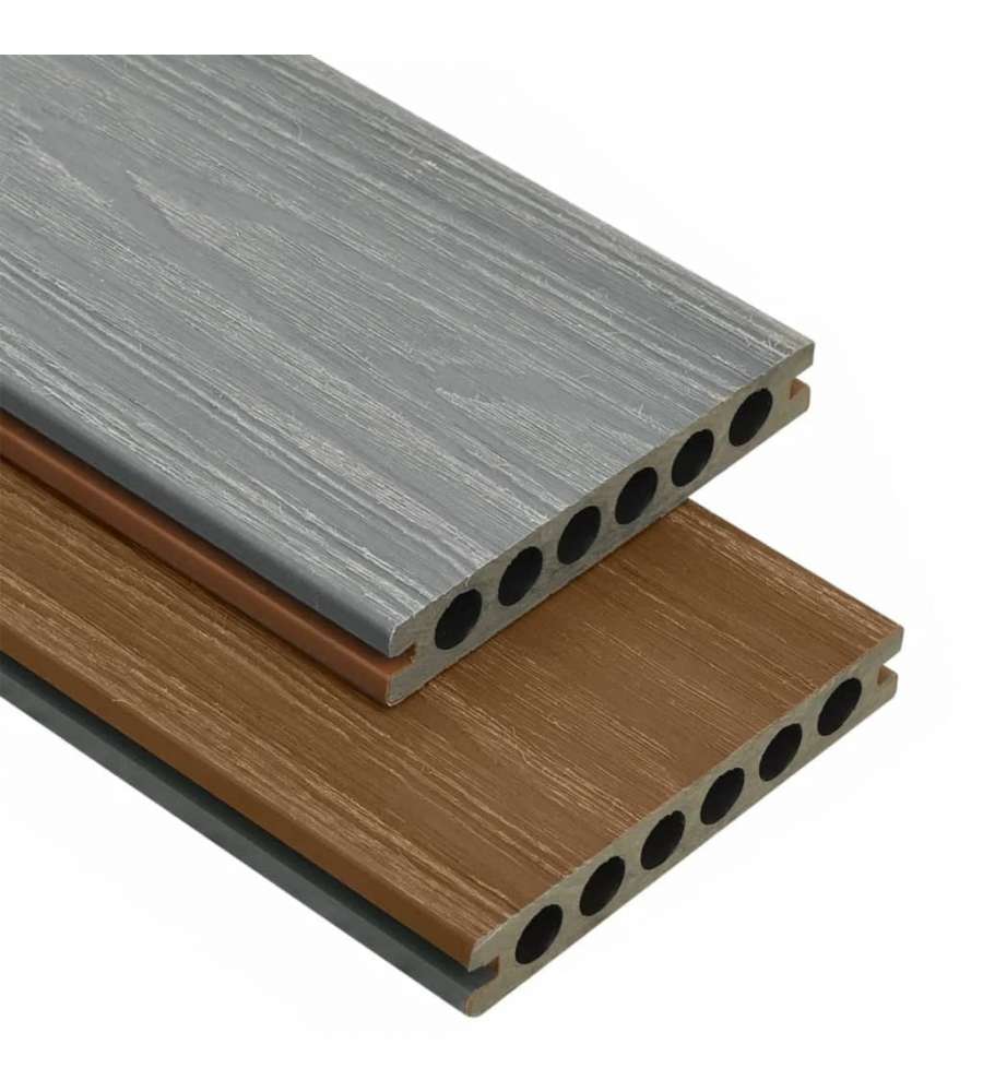 I listoni da terrazza sono realizzata in legno composito plastico, resistenti all'acqua e altamente durevoli al fine di garantire un servizio a lungo termine. I listoni hanno uno spessore di 23 mm, che li rende incredibilmente robusti. A differenza del tradizionale decking in WPC, questo set di listoni ? realizzato per coestrusione per garantire una maggiore resistenza. Questo processo di produzione consiste cui uno strato aggiuntivo viene depositato sopra il decking e impresso in rilievo per conferire la trama caratteristica del legno con venature visibili. Ogni lato del decking presenta un colore differente, un lato marrone, un lato grigio, offrendo maggiore flessibilit? nella selezione dell'aspetto estetico secondo le proprie preferenze.