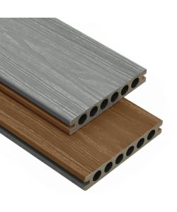 I listoni da terrazza sono realizzata in legno composito plastico, resistenti all'acqua e altamente durevoli al fine di garantire un servizio a lungo termine. I listoni hanno uno spessore di 23 mm, che li rende incredibilmente robusti. A differenza del tradizionale decking in WPC, questo set di listoni ? realizzato per coestrusione per garantire una maggiore resistenza. Questo processo di produzione consiste cui uno strato aggiuntivo viene depositato sopra il decking e impresso in rilievo per conferire la trama caratteristica del legno con venature visibili. Ogni lato del decking presenta un colore differente, un lato marrone, un lato grigio, offrendo maggiore flessibilit? nella selezione dell'aspetto estetico secondo le proprie preferenze.