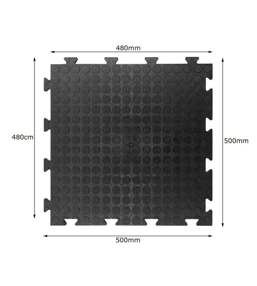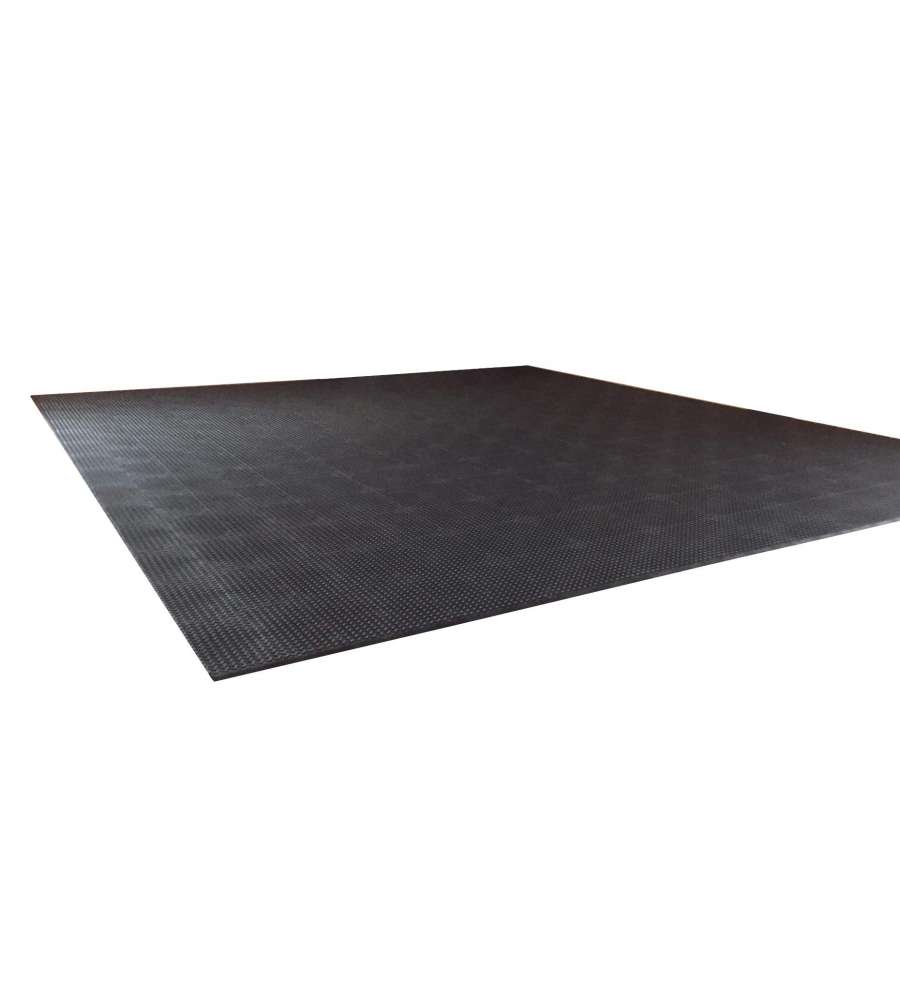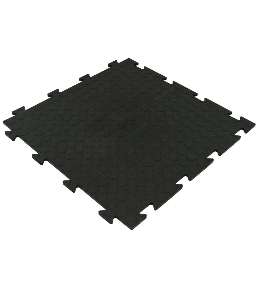 Piastrella in PVC morbida nera 50x50 cm, spessore 8 mm, con superficie antiscivolo. Resistente a sostanze chimiche e impermeabile, ideale per officine, garage e palestre. Facile montaggio con sistema ad innesto per un'installazione rapida.Antiscivolo: