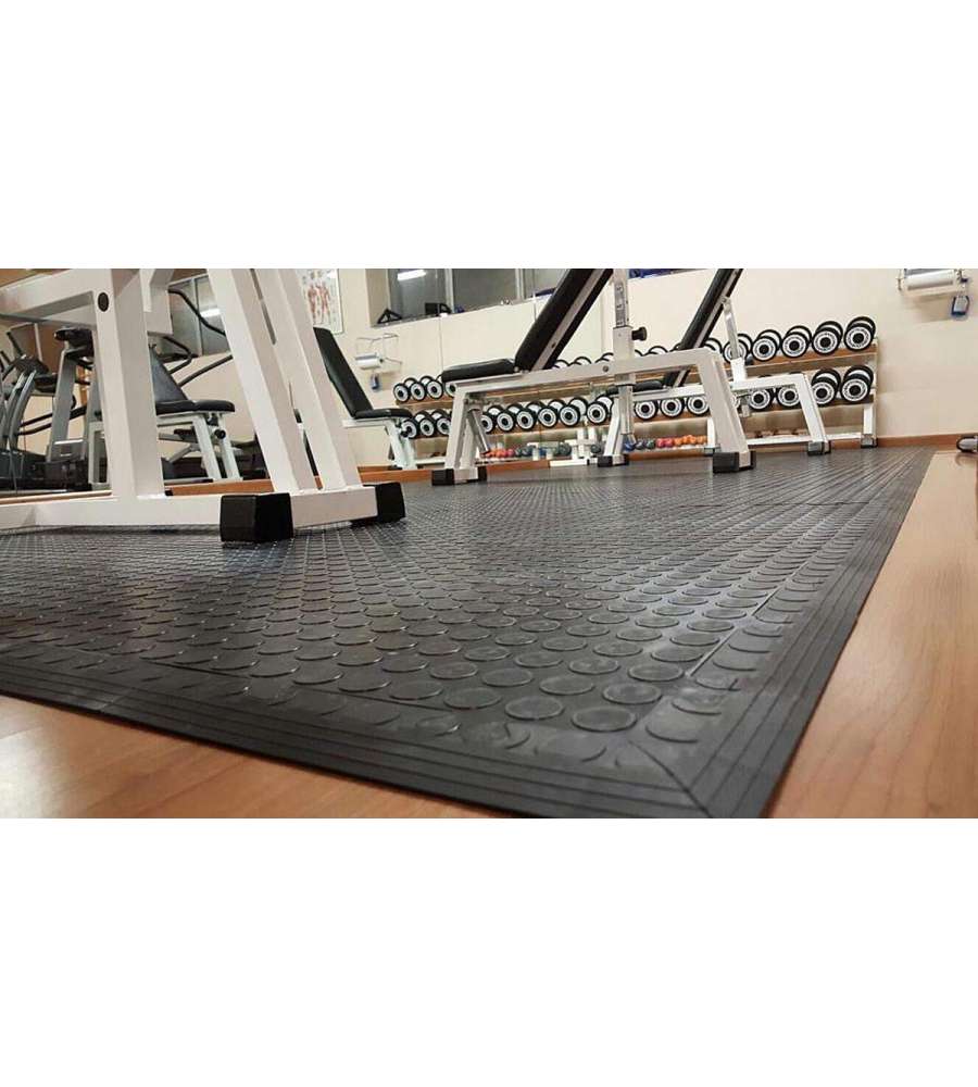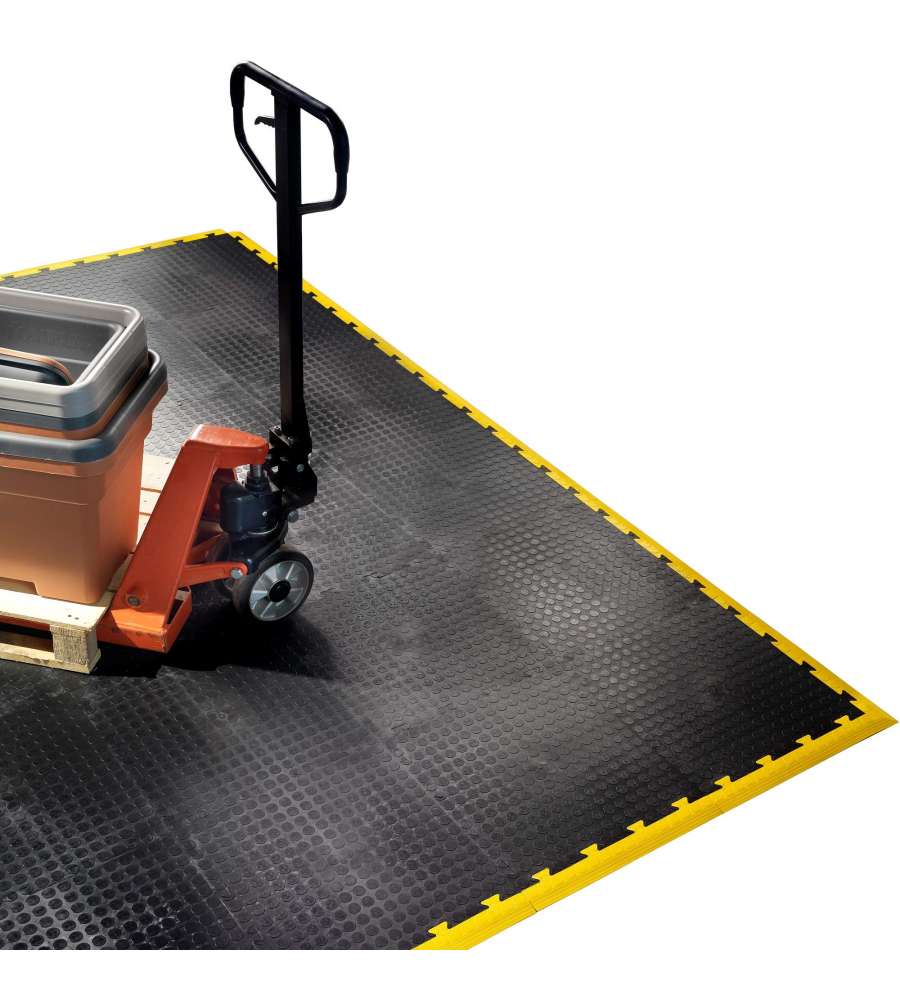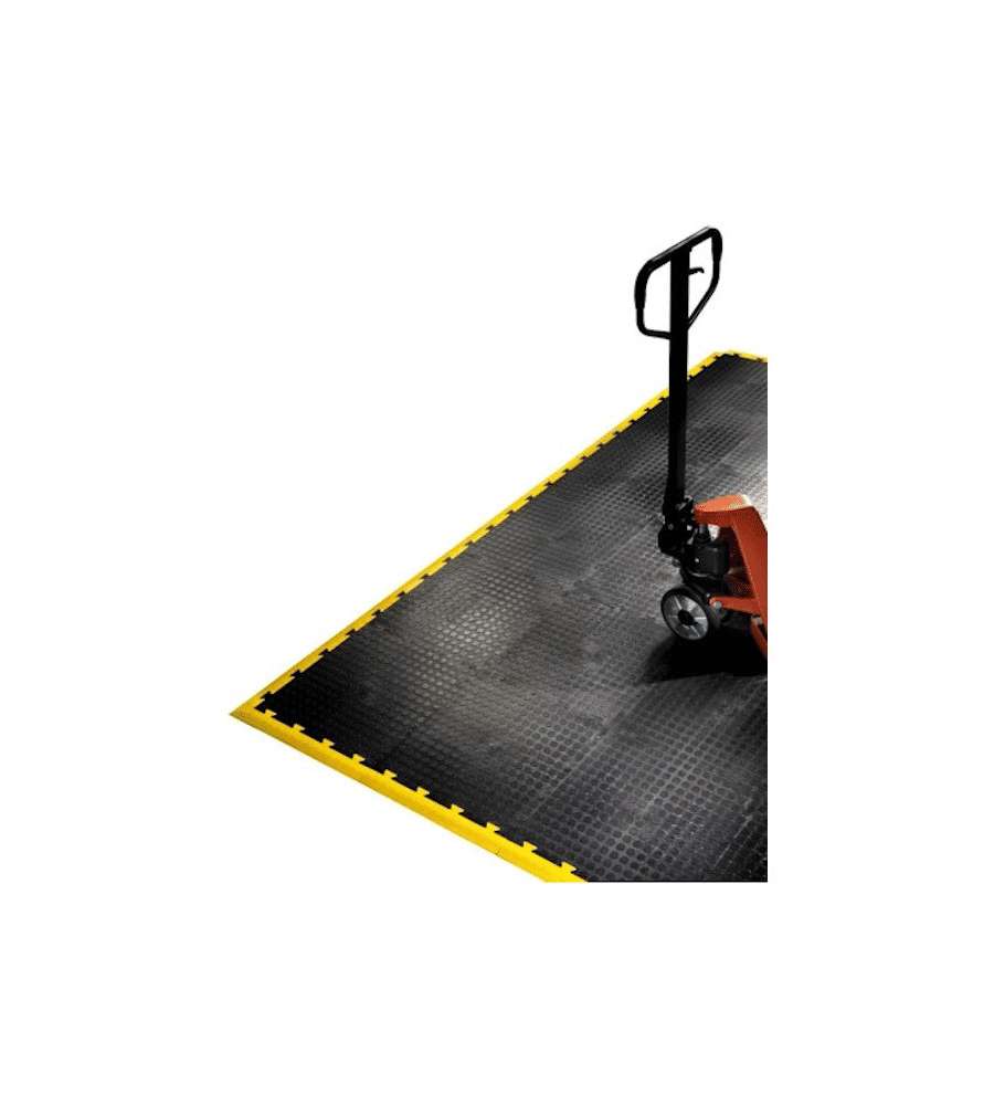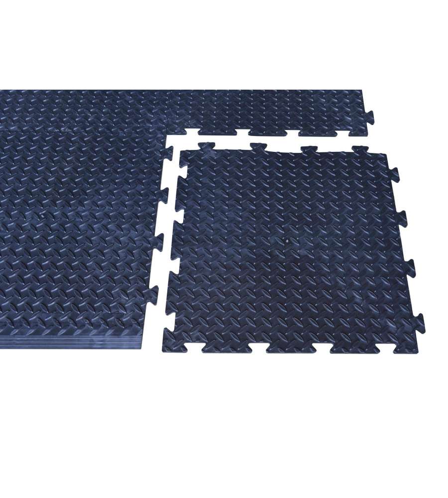 Piastrella in PVC morbida nera 50x50 cm, spessore 8 mm, con superficie antiscivolo. Resistente a sostanze chimiche e impermeabile, ideale per officine, garage e palestre. Facile montaggio con sistema ad innesto per un'installazione rapida.Antiscivolo: