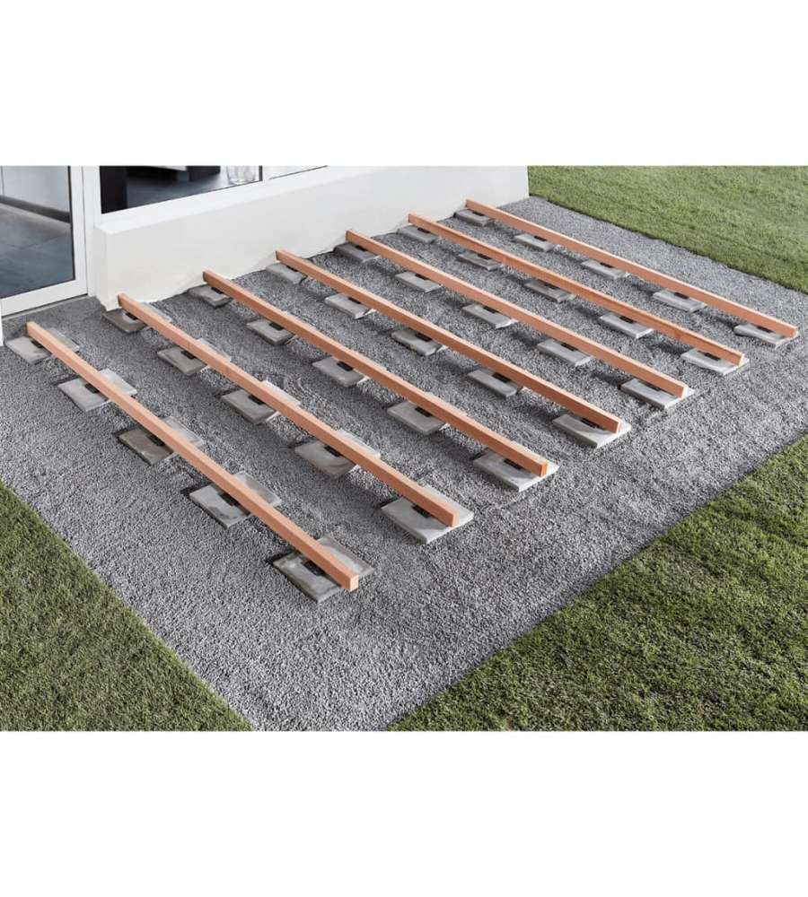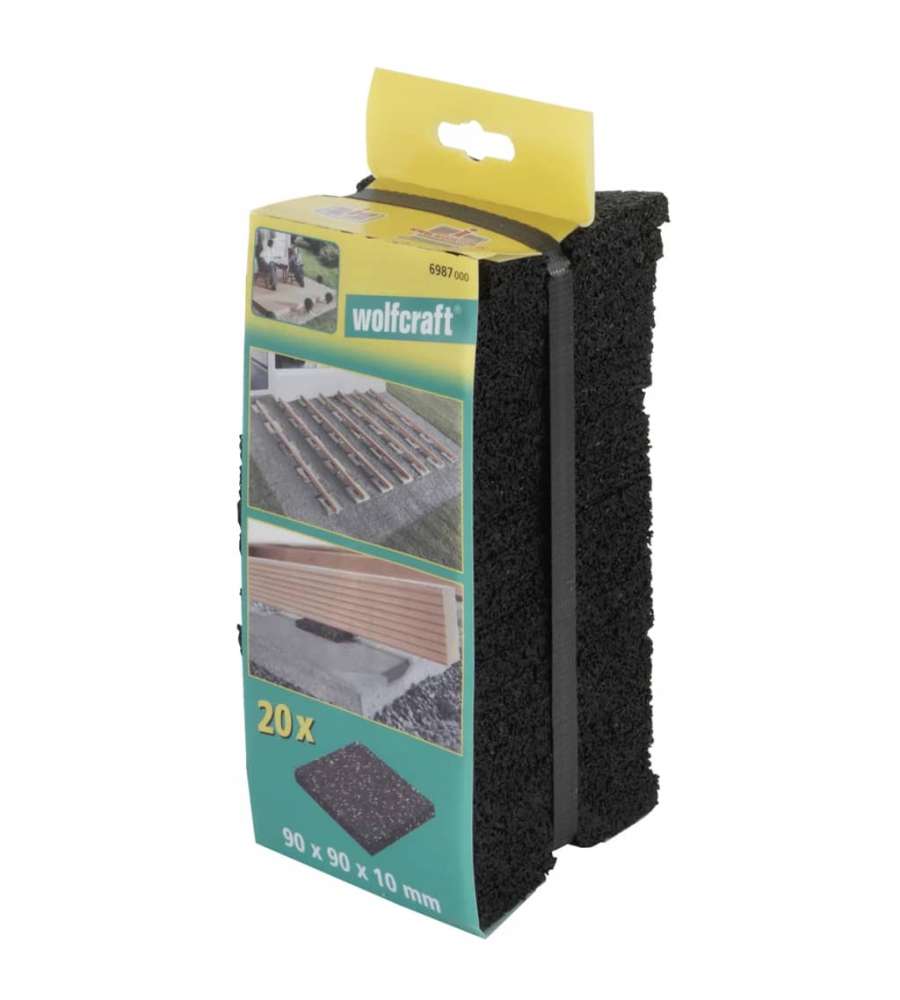 Questi cuscinetti di appoggio della wolfcraft creano distanza tra la fondazione ed i travetti del pavimento.