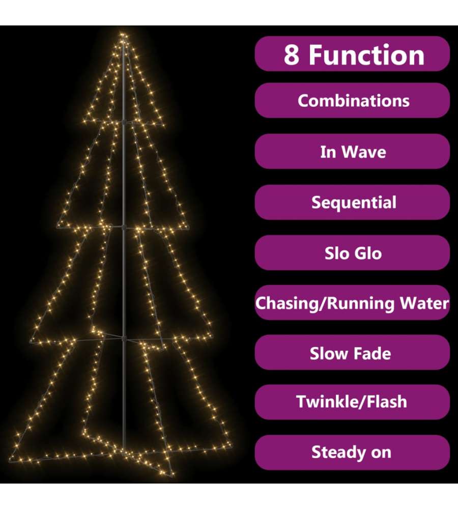 Le luci sono costituite da 360 LED ad alta potenza, sono molto efficienti dal punto di vista energetico ed emettono una luce brillante. Ci sono 8 diversi effetti luce: una combinazione di tutti gli effetti, bagliore lento, scintillio/flash, onde di luce, scorrevole, sequenziale, luce fissa e dissolvenza lenta. Le luci si illuminano magnificamente e creano una magica atmosfera natalizia. Attireranno l'attenzione, soprattutto la sera, e fungeranno anche da accogliente fonte di luce ambientale. L'albero di Natale a cono pu? essere fissato a terra in modo semplice e sicuro con i materiali di montaggio inclusi.