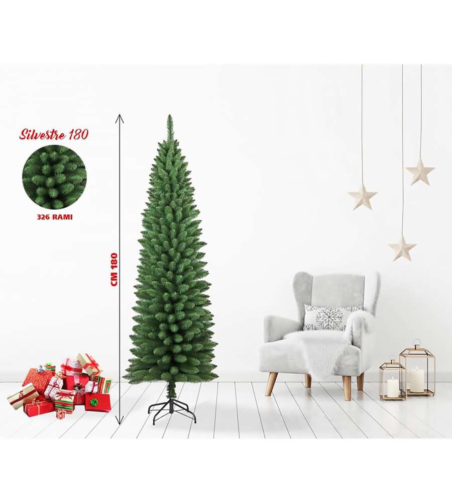 Albero di Natale Silvestre slim 180 cm con 326 rami verde bicolore per un effetto realistico. Realizzato in PVC ignifugo, con base a croce in ferro pieghevole per stabilità. Adatto per interni ed esterni, facile da montare.N° rami: