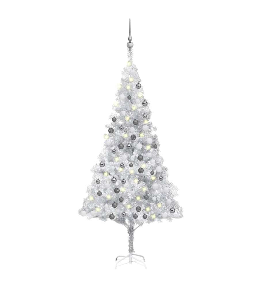 Colore albero: Argento Colore delle palline: bianco lucido, bianco glitter, grigio lucido e grigio glitter Materiale: PET, acciaio, plastica Altezza totale: 180 cm Diametro dell'albero: 93 cm Lunghezza della stringa LED: 15 mAltro 1:
