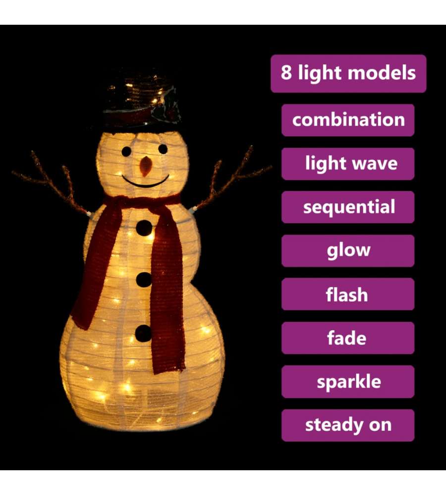 Questo pupazzo di neve ? realizzato in tessuto spesso. Inoltre, questa decorazione natalizia dispone di 60 luci a LED, che sono efficienti dal punto di vista energetico e di lunga durata. Progettato con 8 diversi effetti di luce: una combinazione di tutti gli effetti, bagliore lento, scintillio/flash, in onda, inseguimento/acqua corrente, sequenziale, luce fissa e dissolvenza lenta, si illumina magnificamente e crea una magica atmosfera di vacanza.