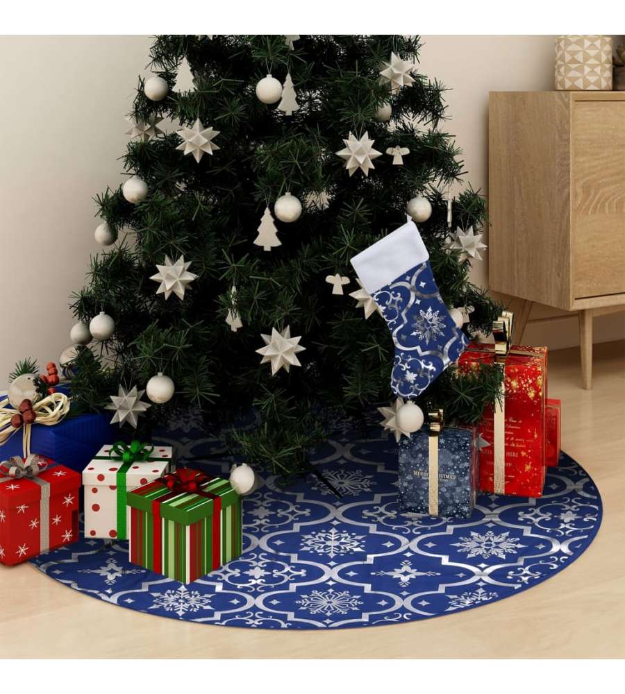 Colore: Blu Materiale: Tessuto (100% poliestere) Diam.: 90 cm Diam. del foro centrale: 10 cm Facile da piegare Presenta un motivo con neve Include una calza di Natale
