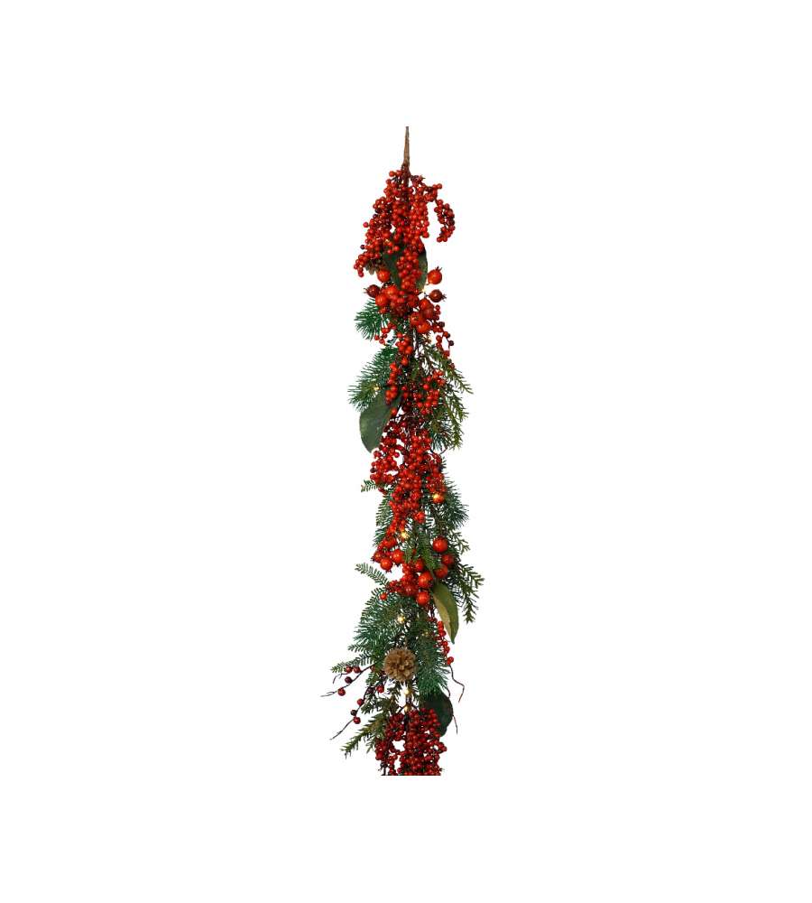 Ghirlanda decorata con pigne e bacche rosse. Realizzata in polietilene, ideale per decorazioni natalizie. Leggera e resistente, perfetta per interni. Aggiunge un tocco festivo a ogni ambiente. Dimensioni esatte: 9 x 15 x 176 cm.