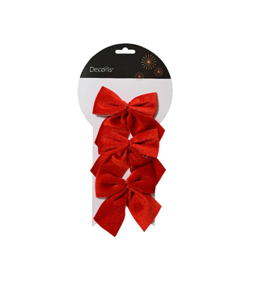 Set di 3 fiocchi di Natale rossi Decoris, ideali per decorare alberi, regali e ghirlande. Realizzati in poliestere resistente, misurano 9x10 cm. Aggiungono un tocco elegante e festivo.Altro 1: