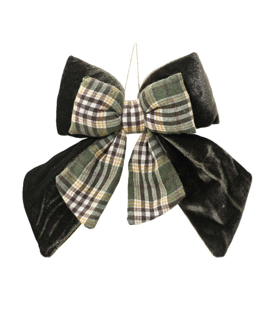 Fiocco Decoris in velluto verde rosmarino, dimensioni 23x18x4,5 cm, perfetto per decorazioni natalizie eleganti e durature. Aggiungi un tocco raffinato al tuo albero o alla tua tavola festiva.
