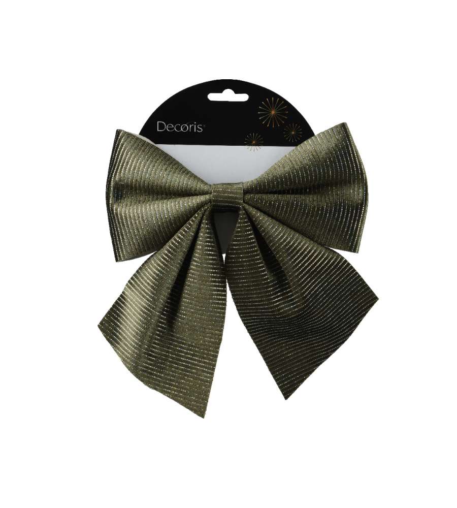 Fiocco verde Decoris, 20x2x24 cm, in poliestere resistente, con filo pieghevole per facile posizionamento. Perfetto per decorazioni natalizie interne su alberi, ghirlande o regali.