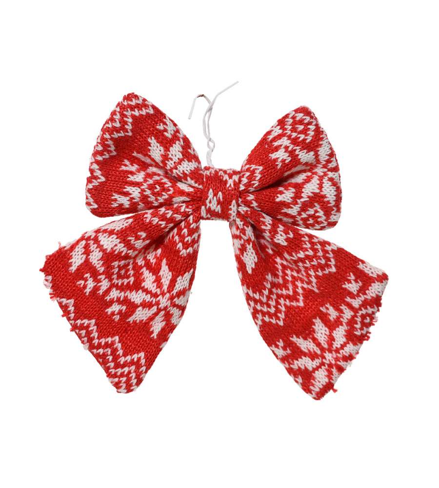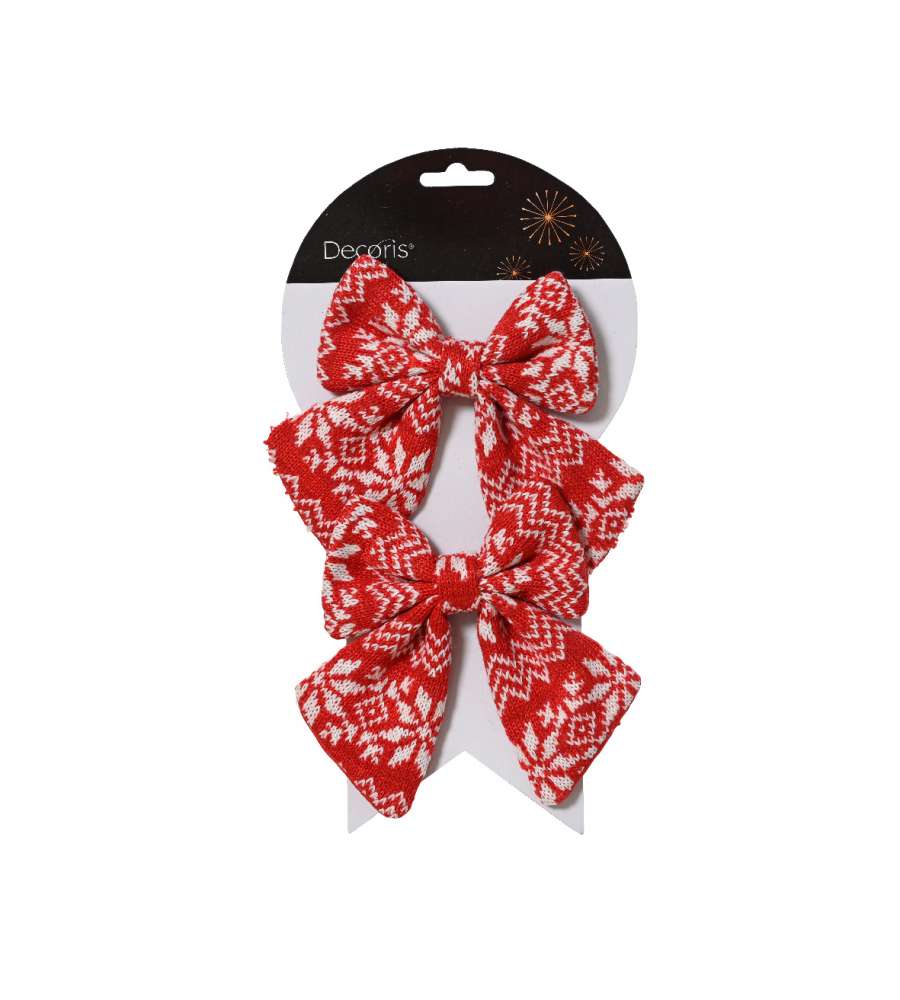 Fiocco Decoris rosso/bianco in poliestere, ideale per decorazioni natalizie. Misura 1x12x13 cm, con filo pieghevole per facile applicazione. Perfetto per alberi, ghirlande o regali.