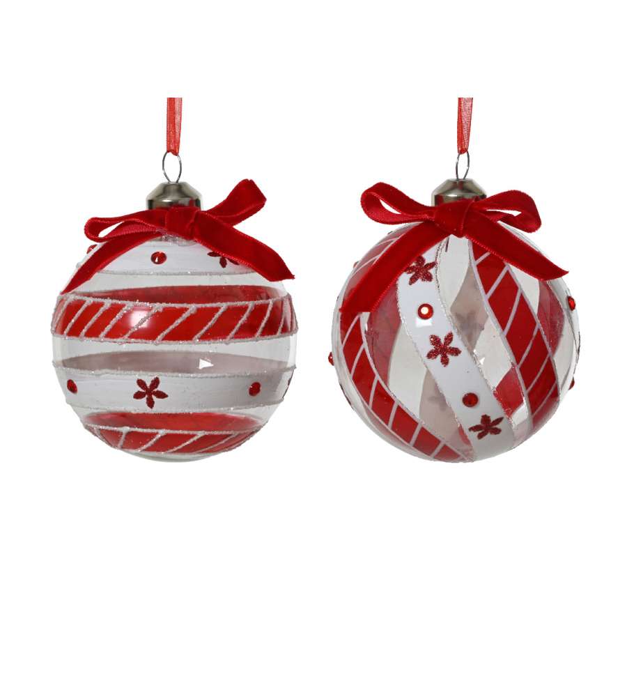 Pallina di vetro Decoris 8cm: eleganza natalizia con glitter, gemme e nastro in organza rosso. Perfetta per un albero scintillante e festoso.