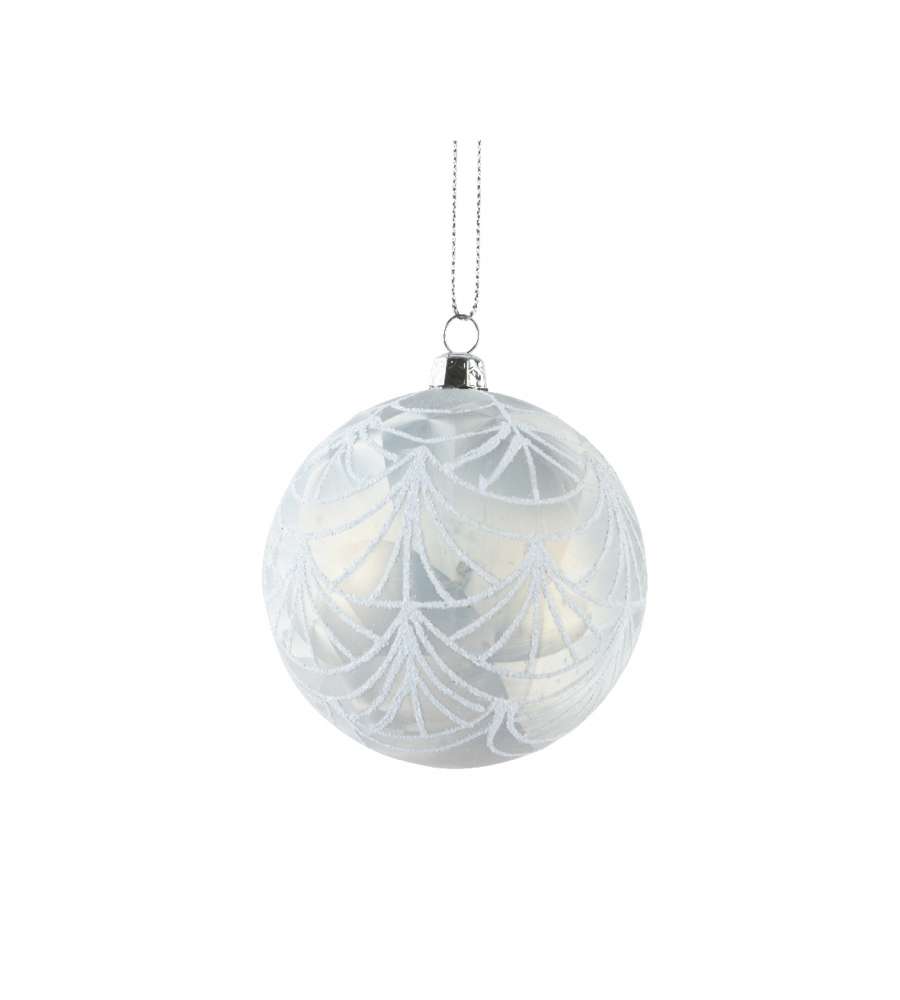 Pallina Decoris argento, 8cm, infrangibile, elegante, con finitura effetto ghiaccio. Realizzata in polistirene riciclato, perfetta per decorazioni natalizie sicure e sostenibili.Uso interno: