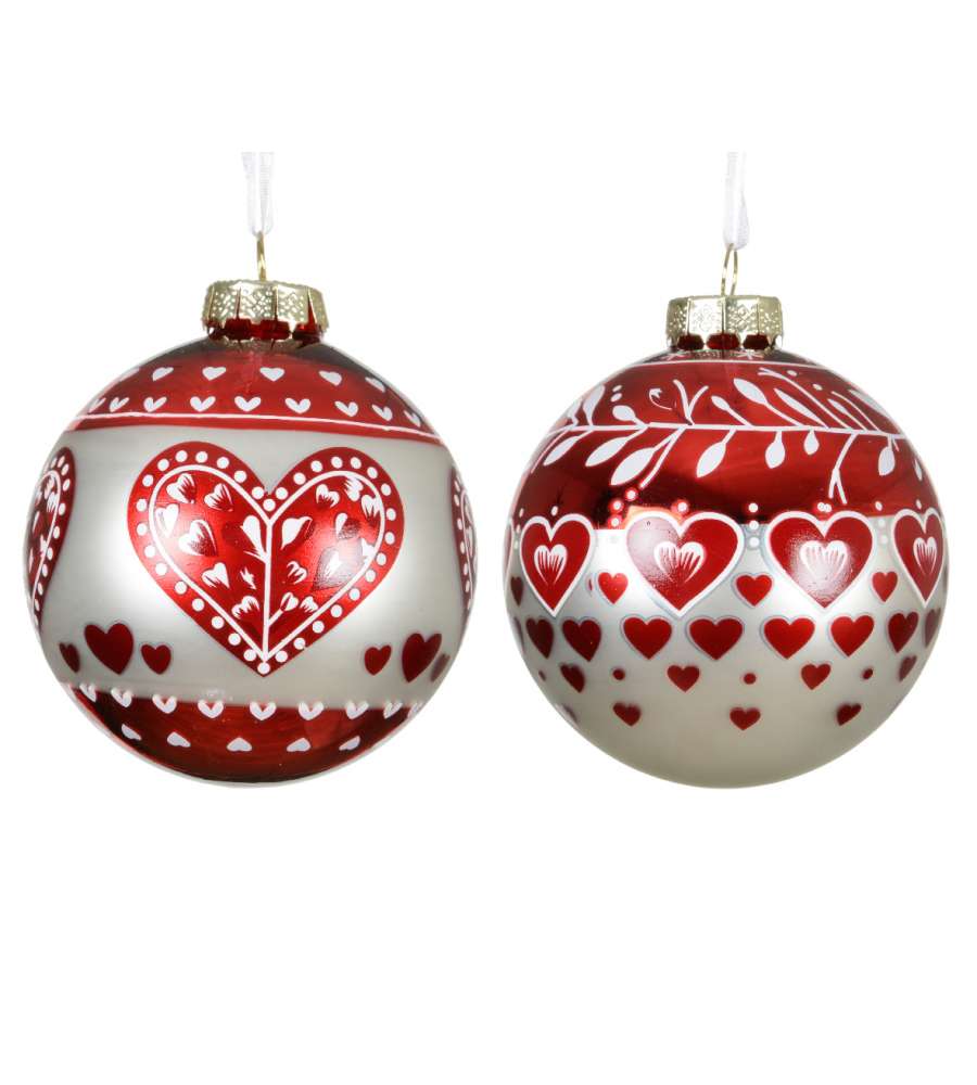 Descrizione: Pallina di vetro Decoris da 8 cm, decorata con cuori rossi su superficie opaca. Elegante e raffinata, perfetta per un albero di Natale unico. Include nastro di organza bianca.