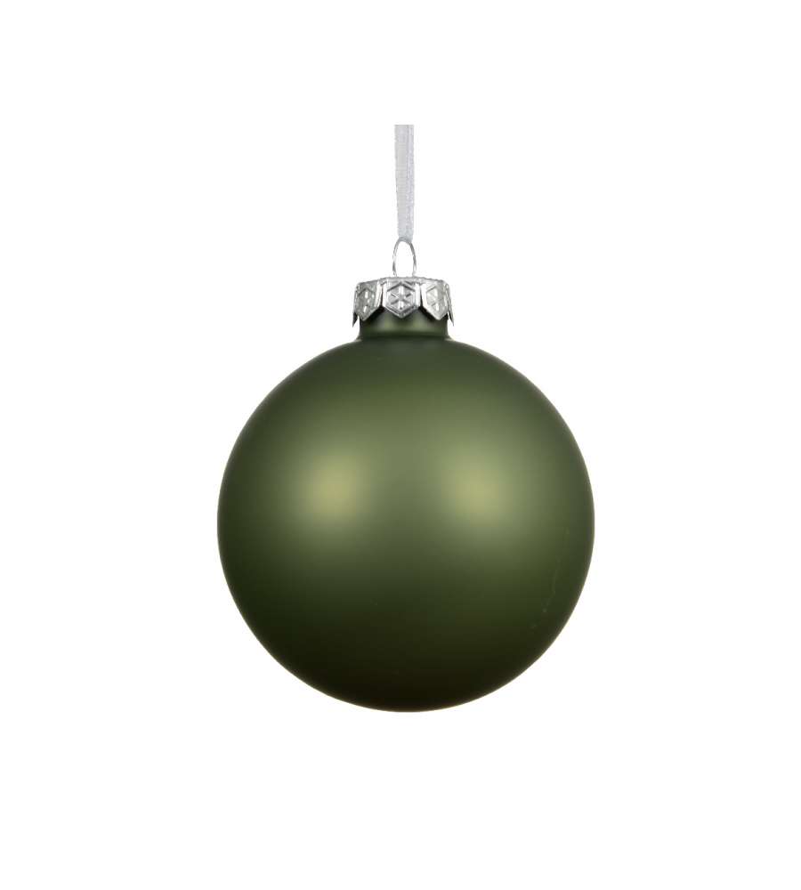 Sfere Decoris in vetro verde rosmarino, diametro 10 cm, finitura matt, con nastro in organza bianca e cap in metallo argentato. Eleganti e perfette per decorare il tuo albero di Natale.