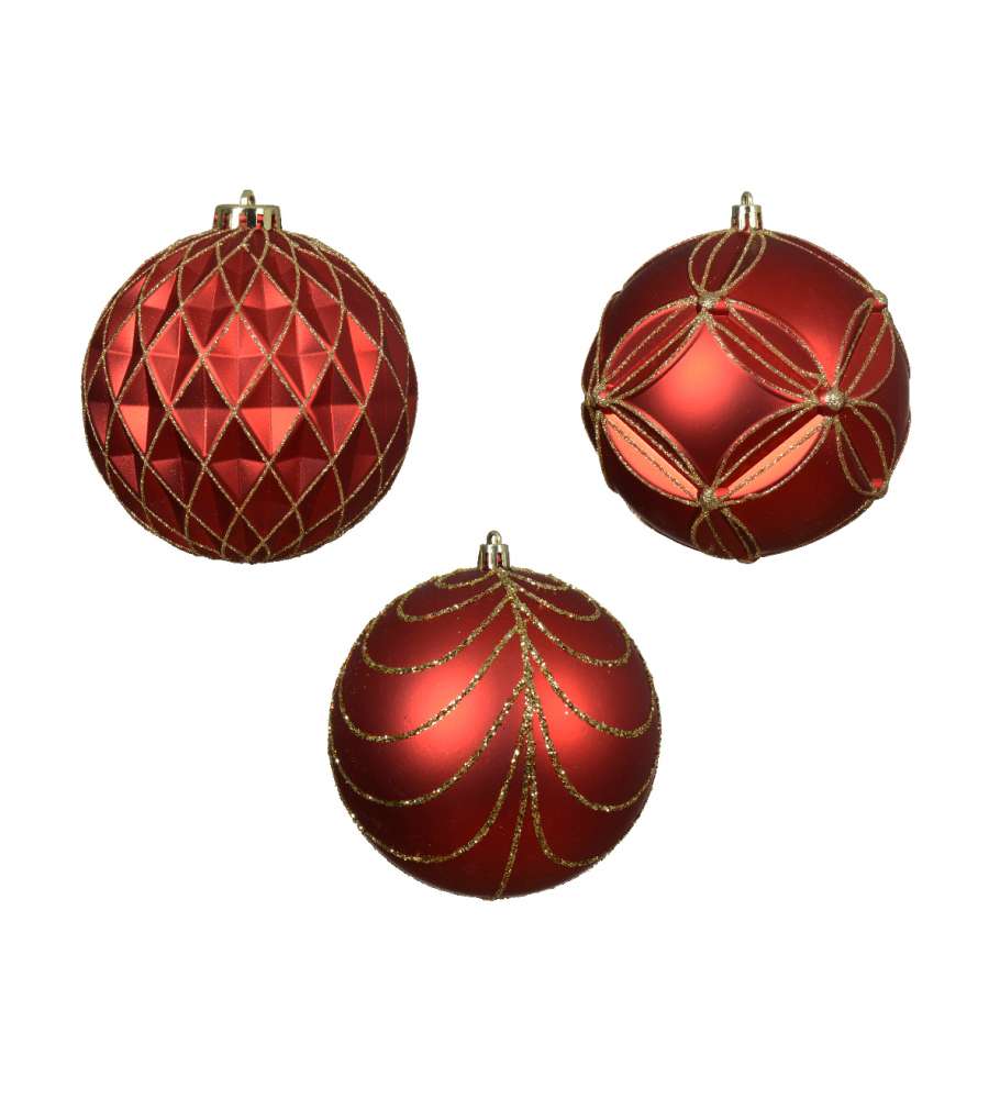 Pallina natalizia rossa e oro, diametro 12 cm, materiale shatterproof, finitura opaca, elegante e sicura, con filo d'oro per appenderla. Perfetta per decorazioni natalizie raffinate.